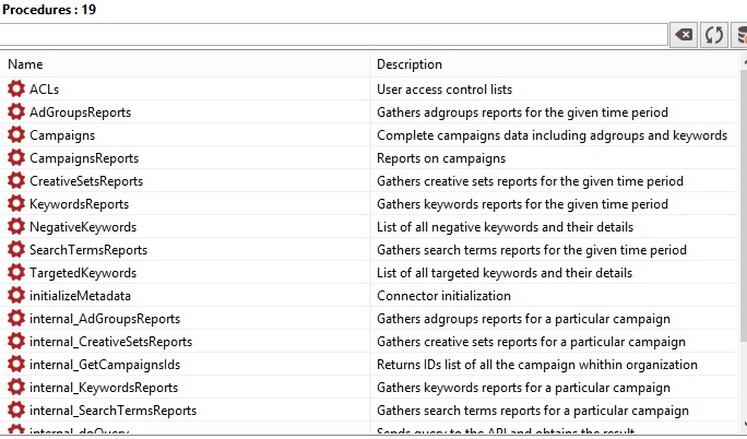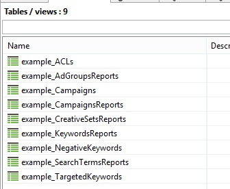 In addition to these public API procedures, there are views in another virtual schema apple_search_ads_examples that shows an exemplary usage of the public API: