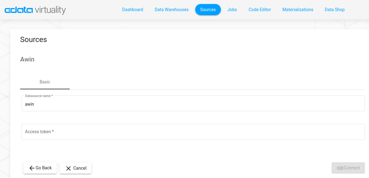 There are two ways to connect to Awin: via the Sources connection wizard in the Web UI (recommended), or using SQL statements in the CData Virtuality Studio or the Code Editor in the Web UI. Here, we describe the first way; for the second way, see the subpage.