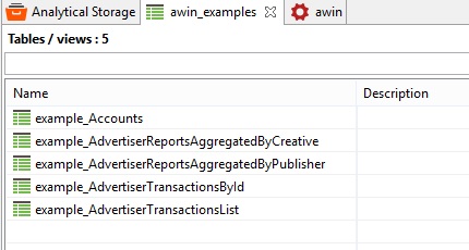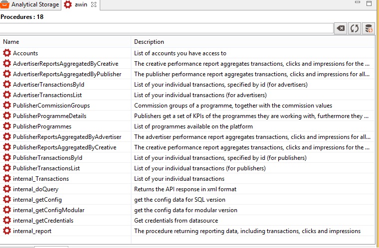The Awin API connector introduces a new virtual schema awin that contains the following stored procedures: