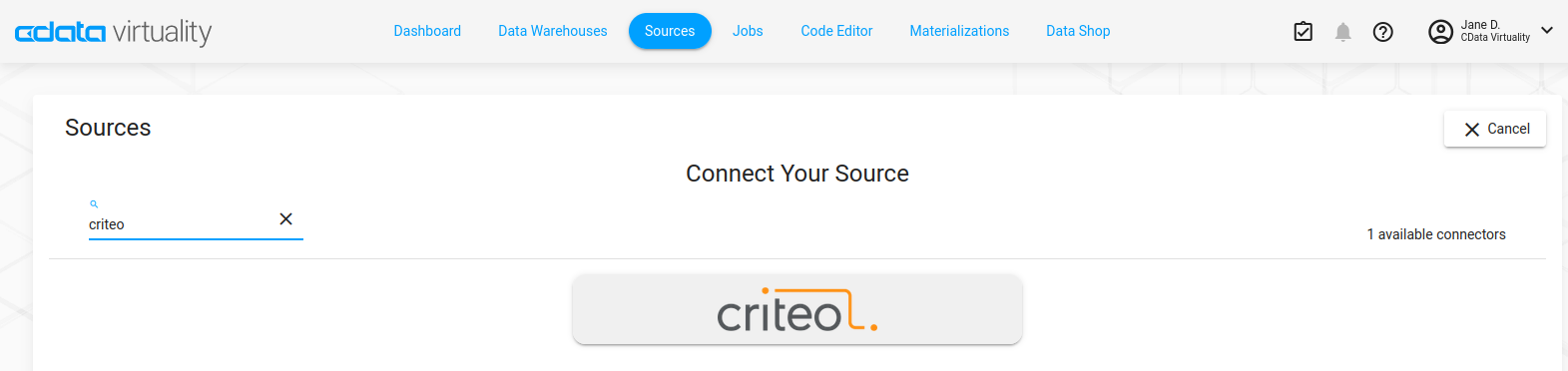 2. Find the Criteo button in the list of connectors or type ‘criteo’ in the search field and select it: