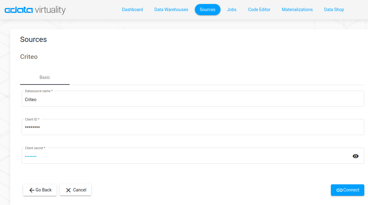 3. Enter the data source name, Client ID, and Client secret, and click Connect: