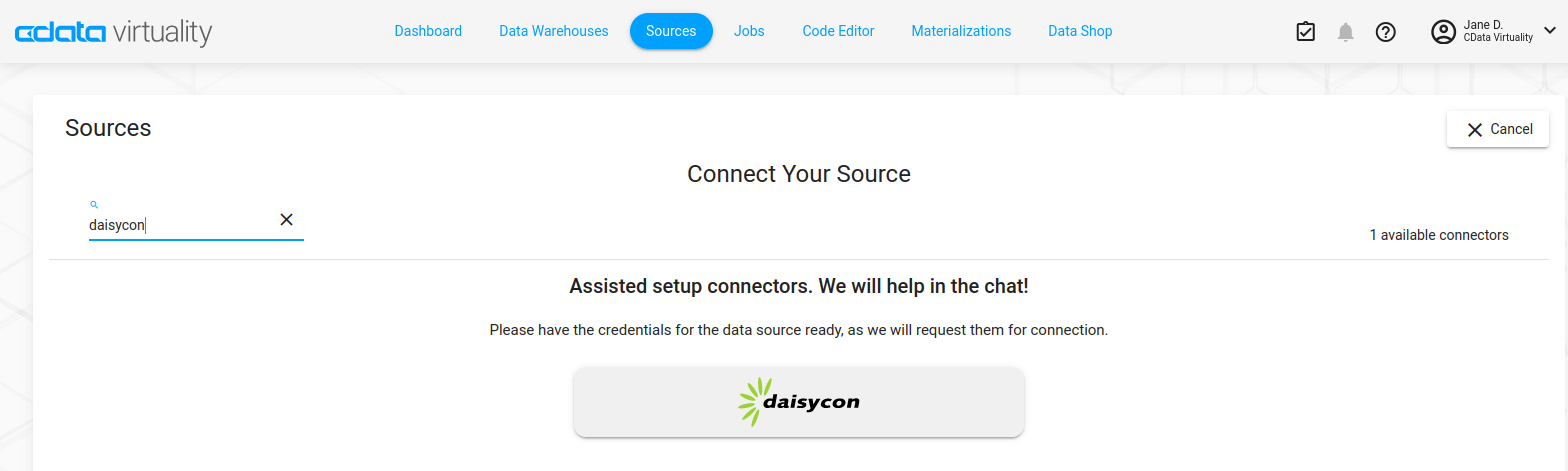 There are two ways to connect to Daisycon: via the Sources connection wizard in the Web UI (recommended), or using SQL statements in the CData Virtuality Studio or the Code Editor in the Web UI. Here, we describe the first way; for the second way, see the subpage.