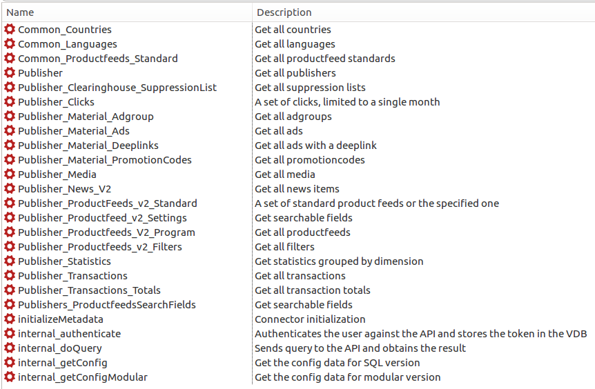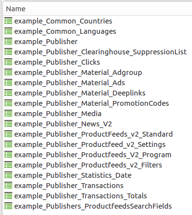 In addition to these public API procedures, there is the daisycon_examples virtual schema that shows an exemplary usage of the public API: