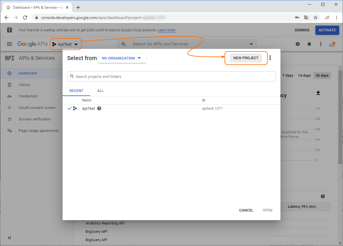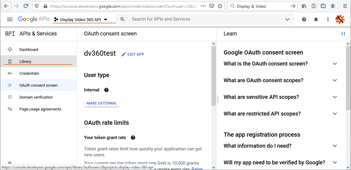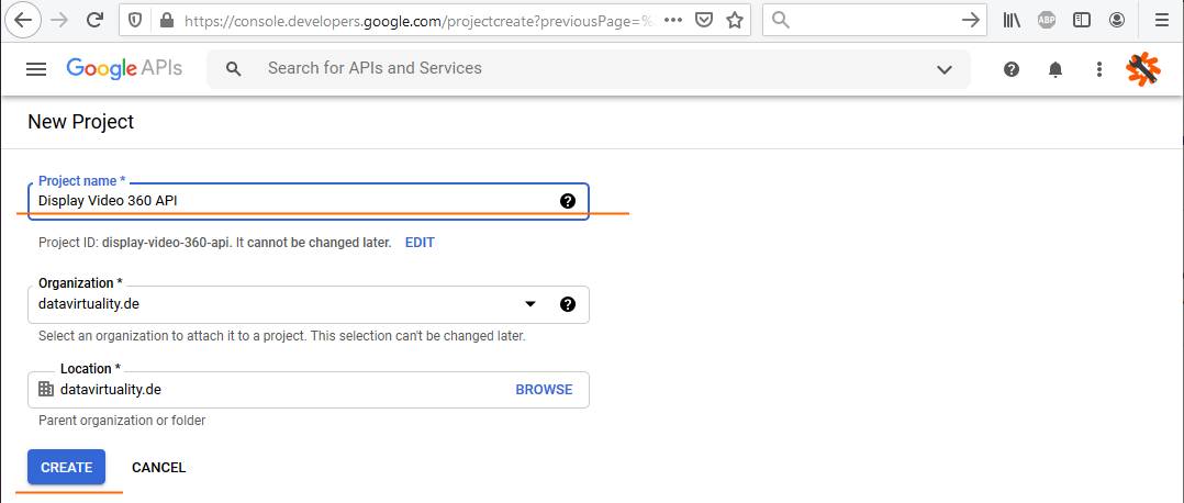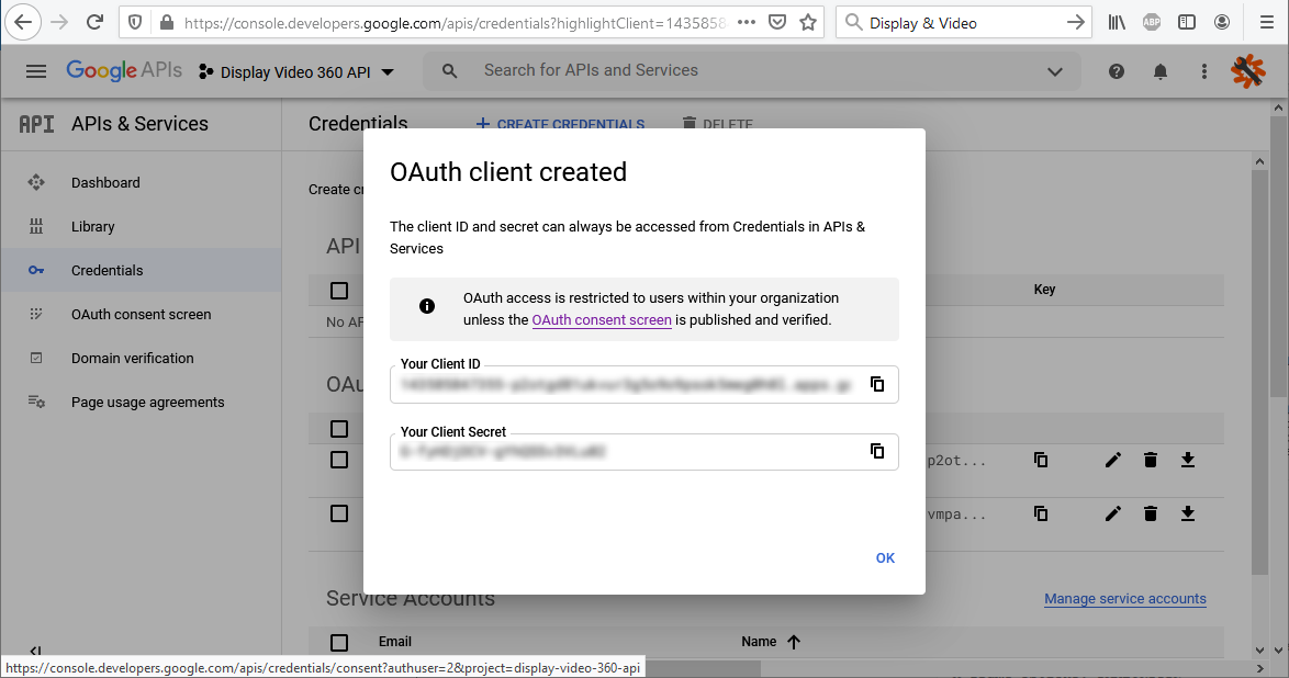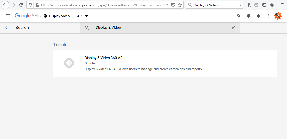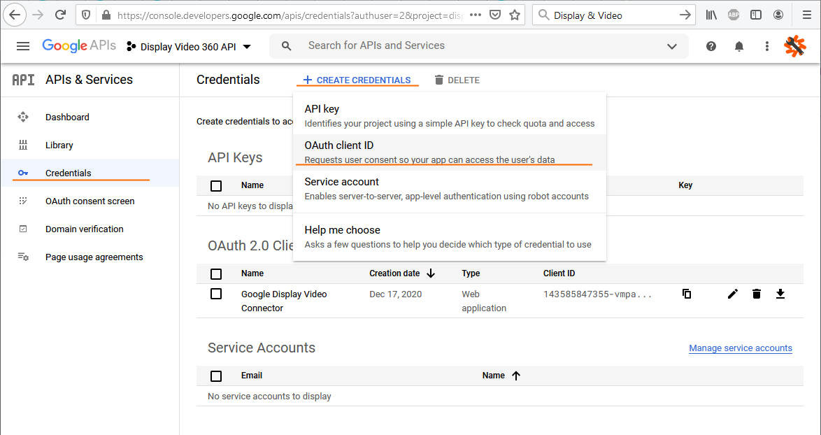 To get credentials for Google Display & Video connectors, first open Google Console using the following URL: https://console.developers.google.com/.