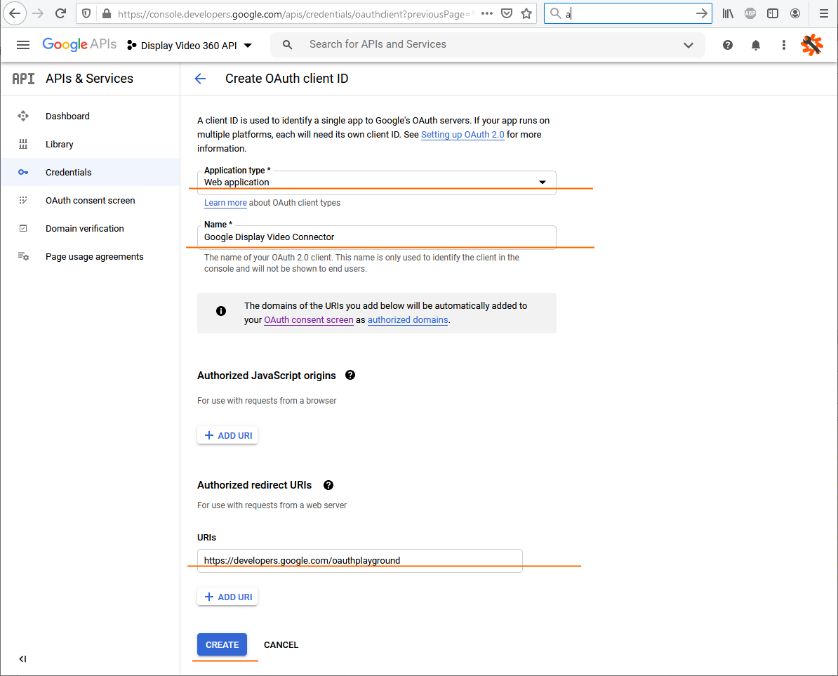 - Fill in the form to request new OAuth credentials, select Web application, and fill in the authorized redirect URL as https://developers.google.com/oauthplayground: