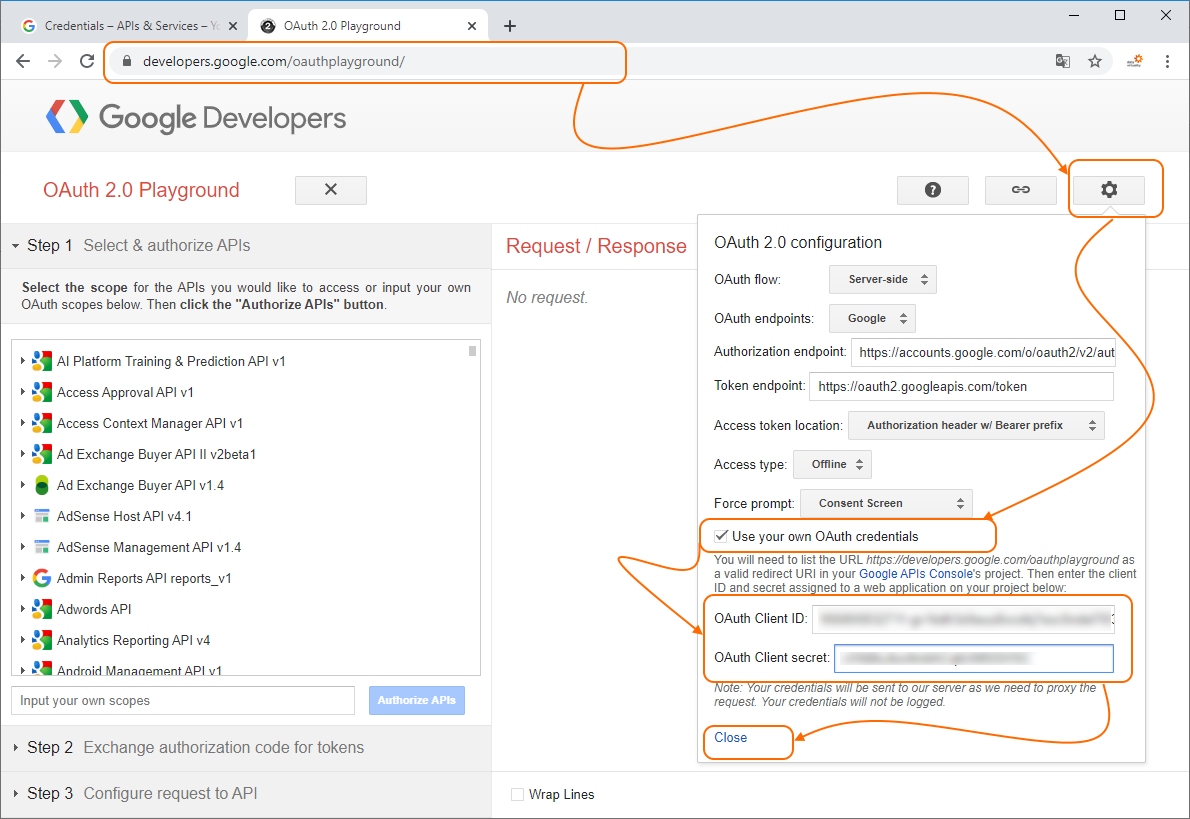 - Open OAuth Playground - https://developers.google.com/oauthplayground and use settings to enter the credentials you obtained on the previous step: