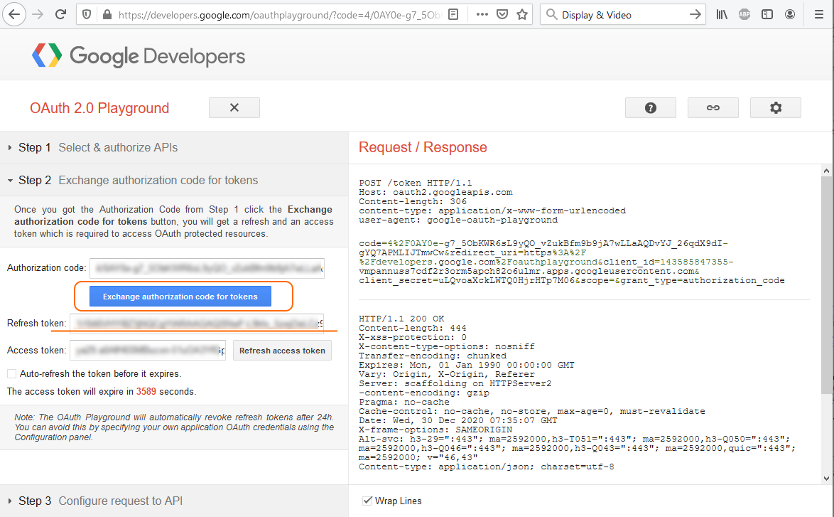 - You will be redirected to a new page and see a temporary authorization code. Click the Exchange authorization code for tokens button.