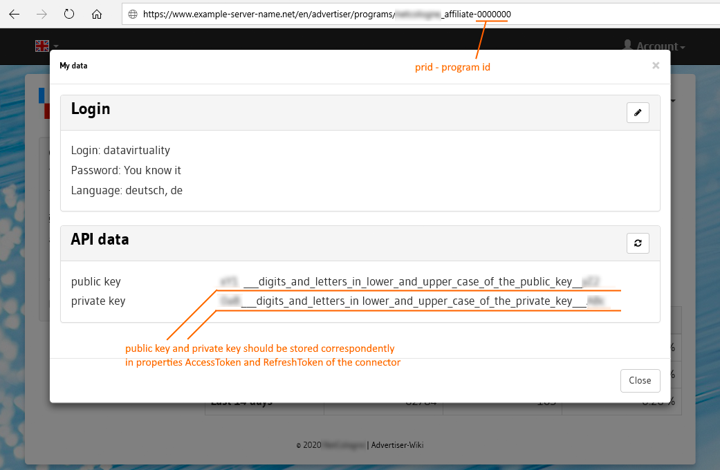 - AccessToken and RefreshToken (string) - a pair of public and private API keys. Login to your Lead Alliance account to get a pair of public and private API keys. Click "Account" in the upper right corner of the web page, then select "My data", a pop-up window with API data will appear. These parameters will be named in the connector parameters as AccessToken (for the public key) and RefreshToken (for the private key);