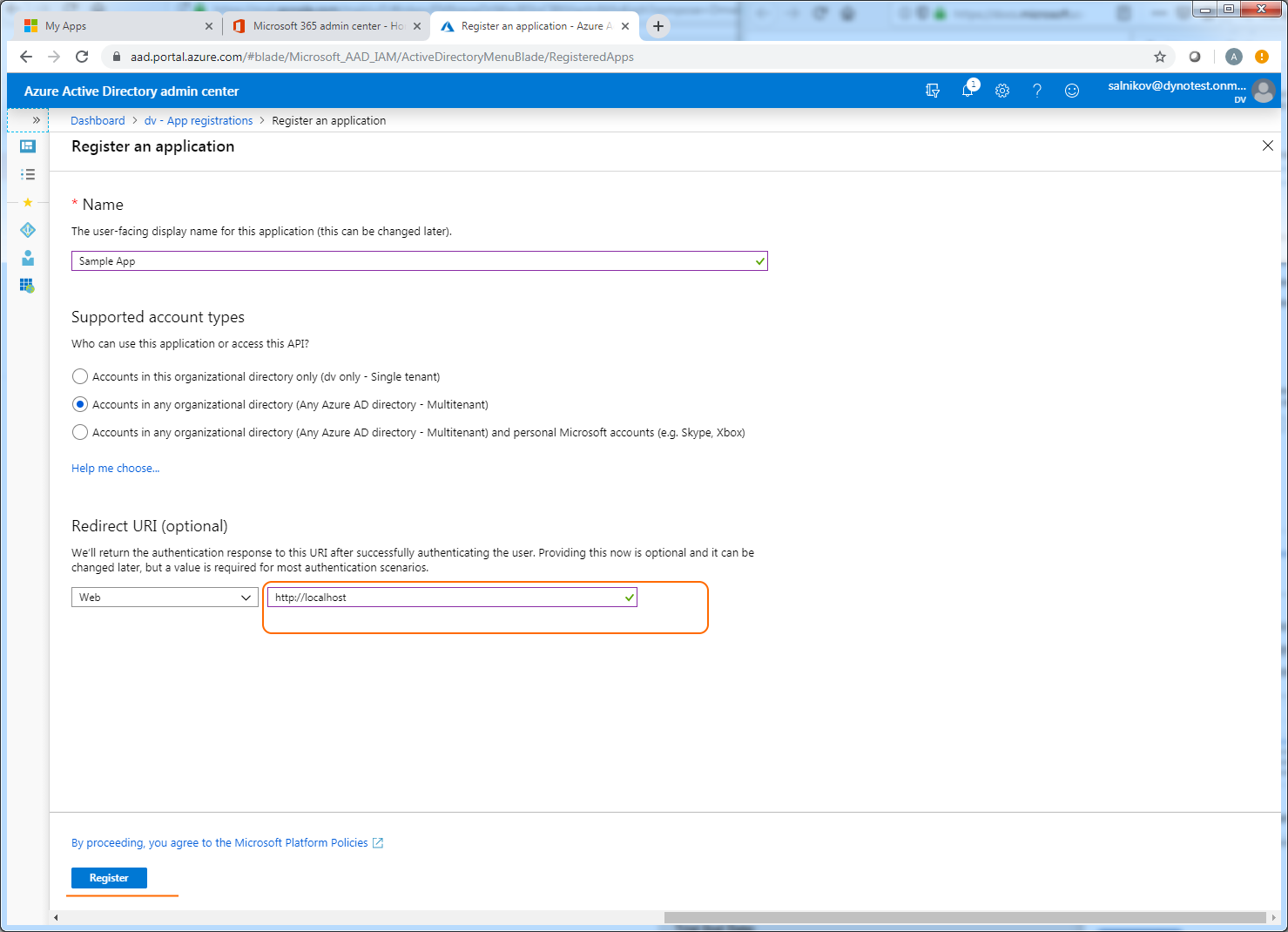 During registration, please enter Redirect URI as http://localhost as shown on the screenshot: