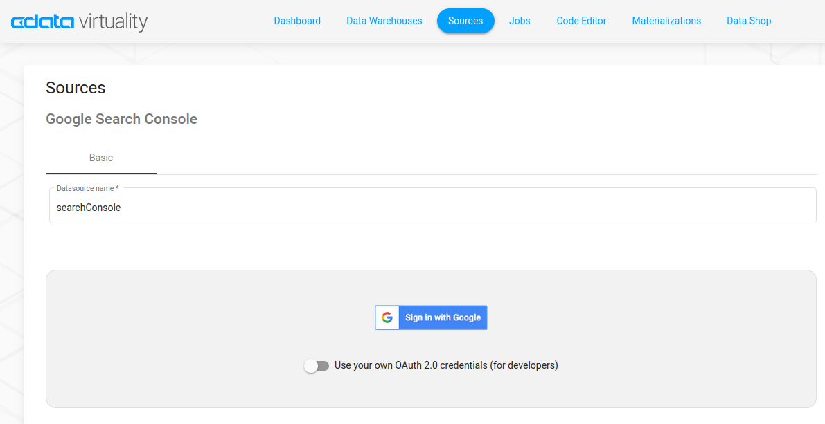 3. Enter the data source name, click Sign in with Google, and follow the instructions: