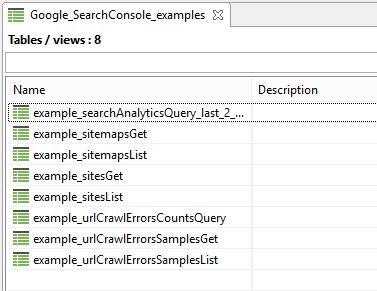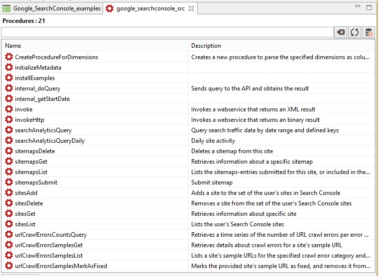 The Google Search Console API connector introduces a new virtual schema google_searchconsole_src that contains the following procedures: