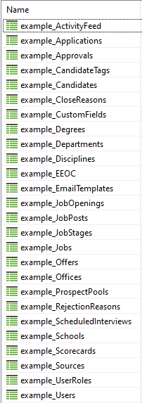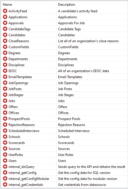 The Greenhouse API connector introduces a new virtual schema greenhouse that contains the following stored procedures: