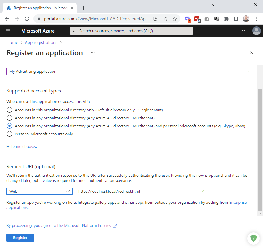 Type the name and select the applicable application tenancy, depending on your configuration. For this setup, we select Accounts in any organizational directory (Any Azure AD directory - Multitenant) and personal Microsoft accounts (e.g. Skype, Xbox).