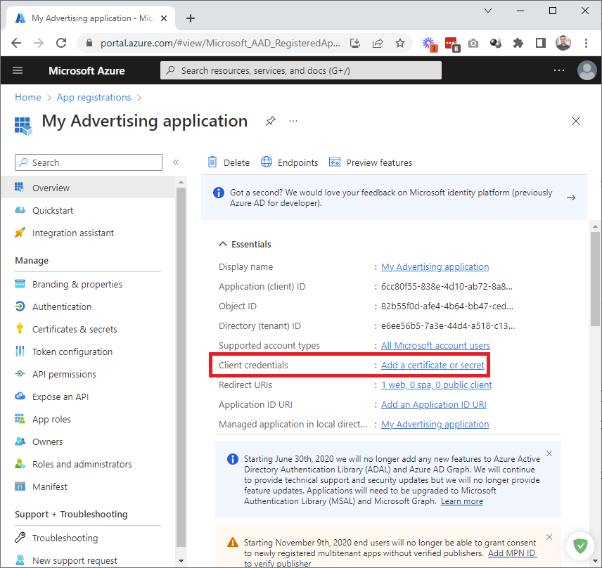 Now create an application secret. Click Add a certificate or secret: