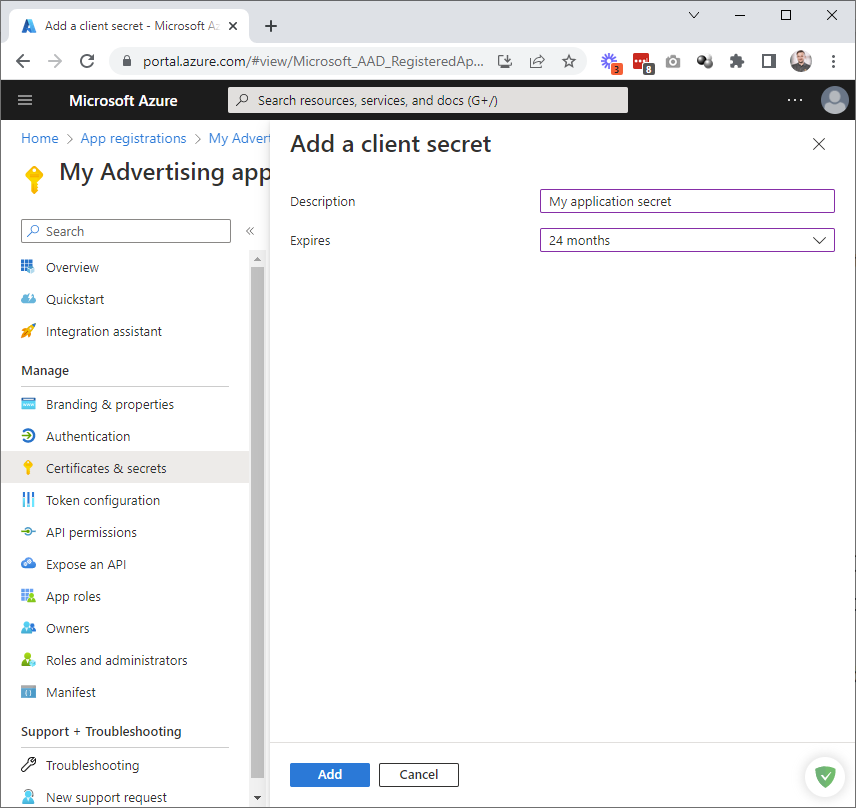 Add a secret description and set the expiration date. The maximum allowed expiration is 24 months. Set this according to your desired security policy. You will need to re-generate the application tokens by following this process when the secret expires: