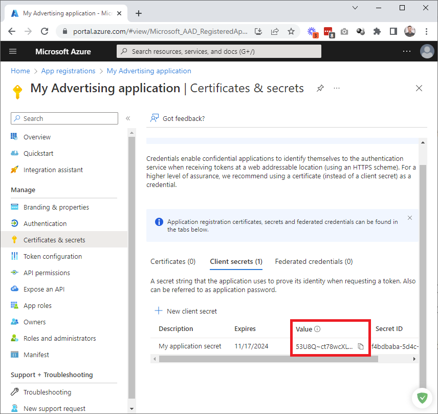 Save the client secret, when you create it. This is the only time the secret is displayed to you. You will not be able to read the secret after you navigate away from this page. We need the Value - do not confuse it with the Secret ID (which is not used in the authentication process). You can copy the secret value to the clipboard by clicking the appropriate icon: