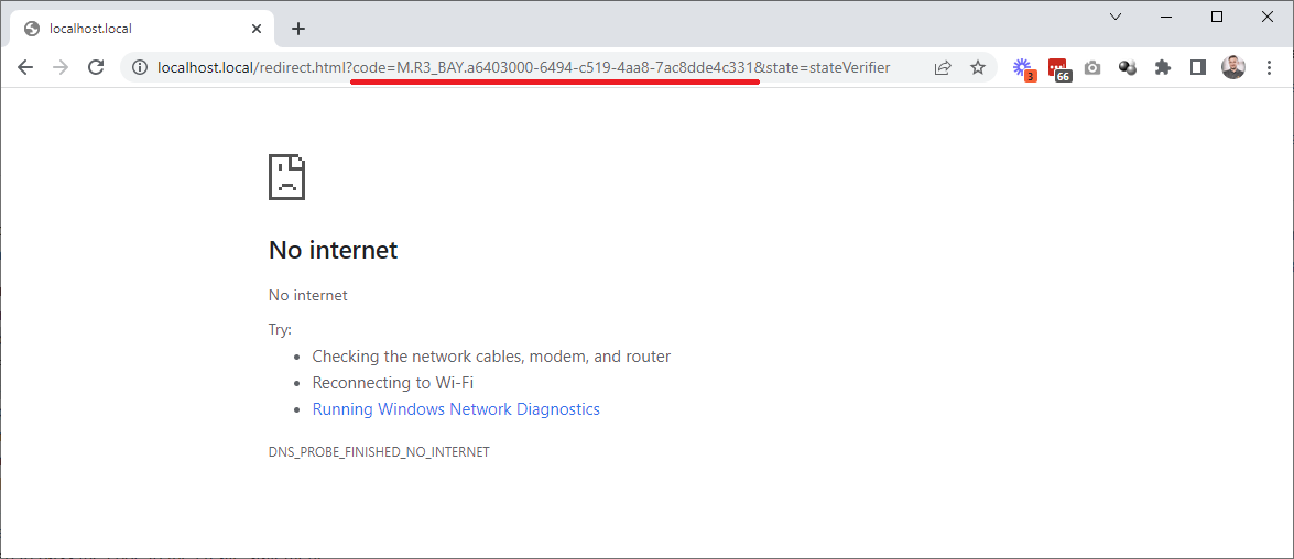 The short-lived authentication token is returned to the submitted redirect URI under the name code. Save this value. What you normally see, is an error, however the value, which we need on this step, is in the address bar of the browser. Note that the value is valid for a few minutes only, so, be sure to follow the next steps as quickly as possible (within a few minutes). Additionally, this value is disposable, as such if it is used once, and the refresh token is not saved, the authentication process has to be repeated. As the value on the screenshot has already been used, it is not a security breach to openly publish it: