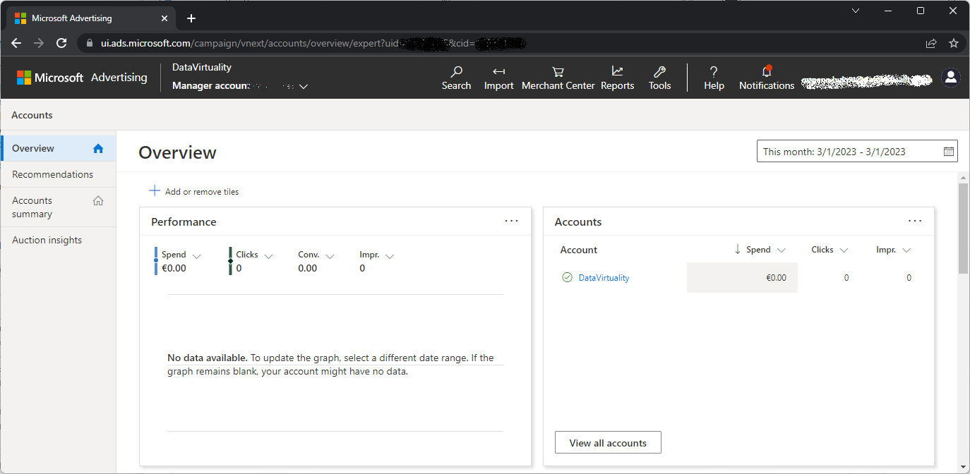 Navigate to https://ui.ads.microsoft.com/campaign/vnext/accounts. Select the account you want to connect via the API. Here you can choose between the manager account and an ad account. To acquire the data for all connected accounts you may omit the Account Id property. However, to retrieve data for a particular ad account, its Id should be specified. To get a user's customer ID and account ID, you can sign in to the Microsoft Advertising web application and click on the Campaigns tab. The URL will contain a cid key/value pair in the query string that identifies your customer ID, and an aid key/value pair that identifies your account ID. For example, https://ui.ads.microsoft.com/campaign/Campaigns.m?cid=FindCustomerIdHere&aid=FindAccountIdHere#/customer/FindCustomerIdHere/account/FindAccountIdHere/campaign.