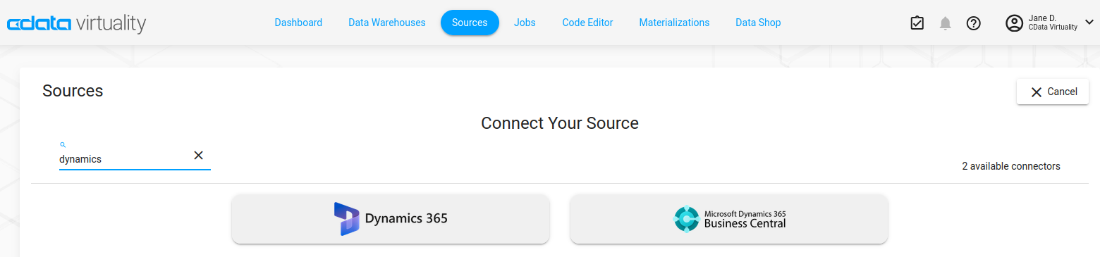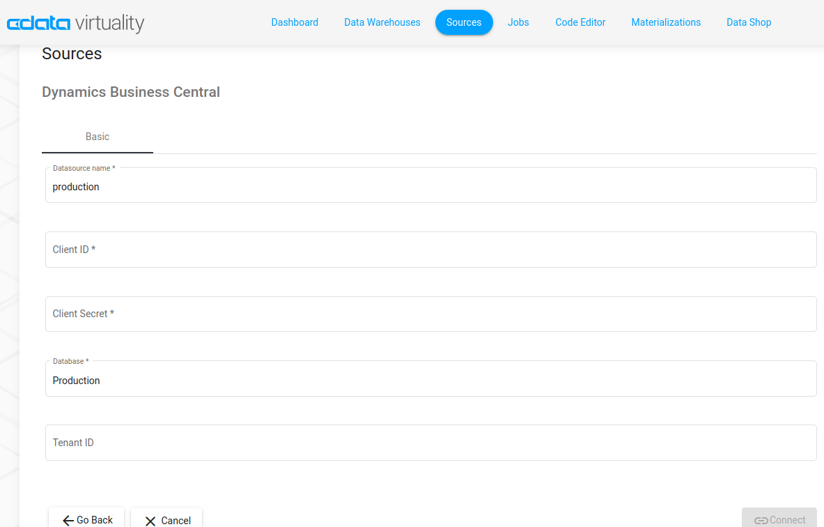 There are two ways to connect to Microsoft Dynamics 365 Business Central: via the Sources connection wizard in the Web UI (recommended), or using SQL statements in the CData Virtuality Studio or the Code Editor in the Web UI. Here, we describe the first way; for the second way, see the subpage.
