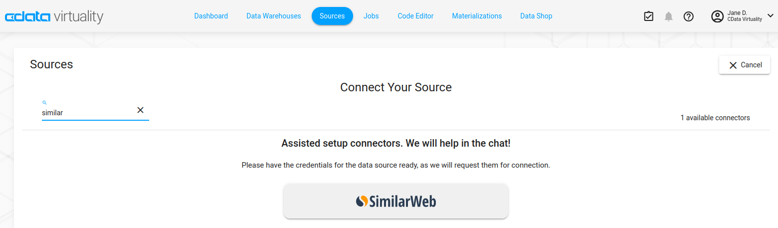 There are two ways to connect to Similarweb: via the Sources connection wizard in the Web UI (recommended), or using SQL statements in the CData Virtuality Studio or the Code Editor in the Web UI. Here, we describe the first way; for the second way, see the subpage.