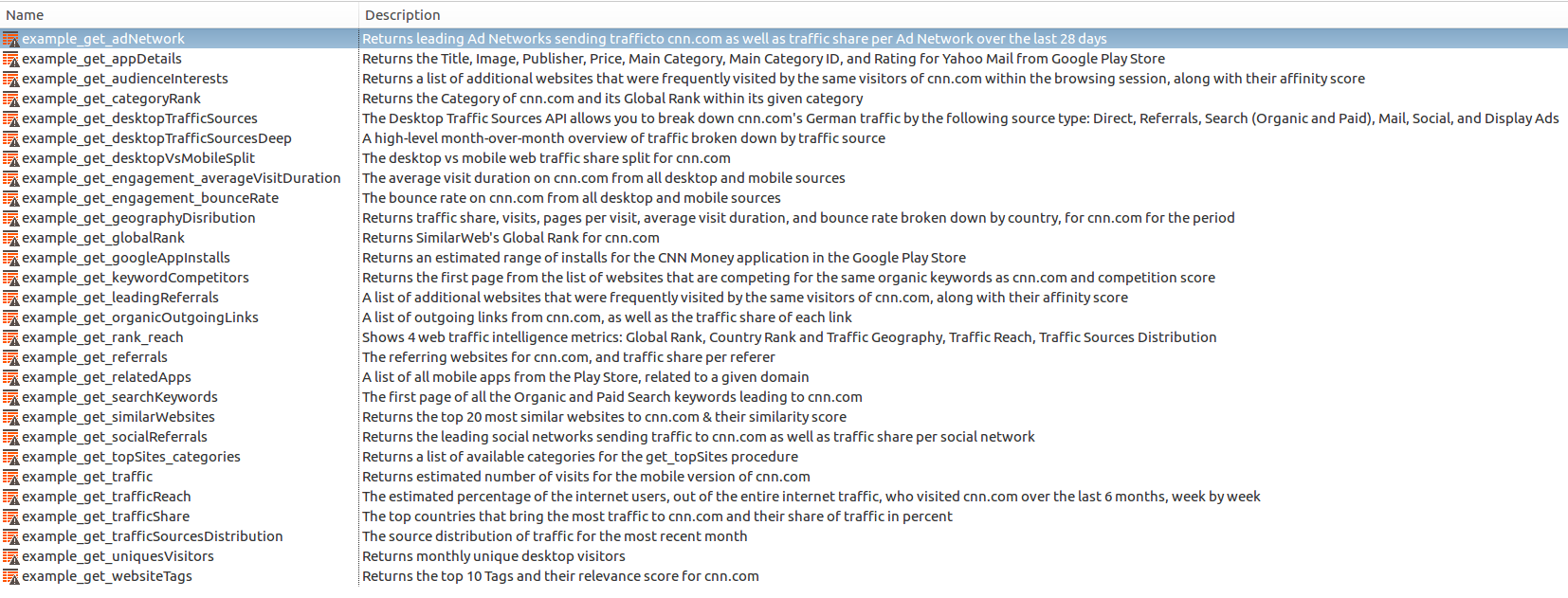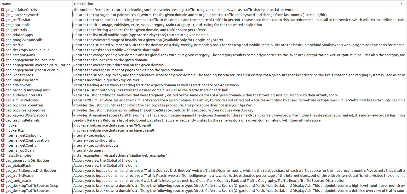 The Similarweb APIconnector introduces a new virtual schema similarweb that contains the following stored procedures: