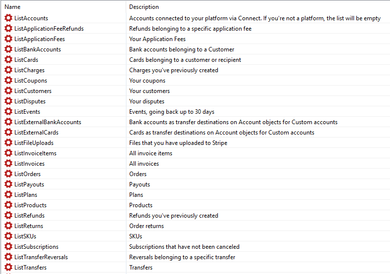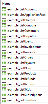 The Stripe API connector introduces a new virtual schema stripe that contains the following stored procedures: