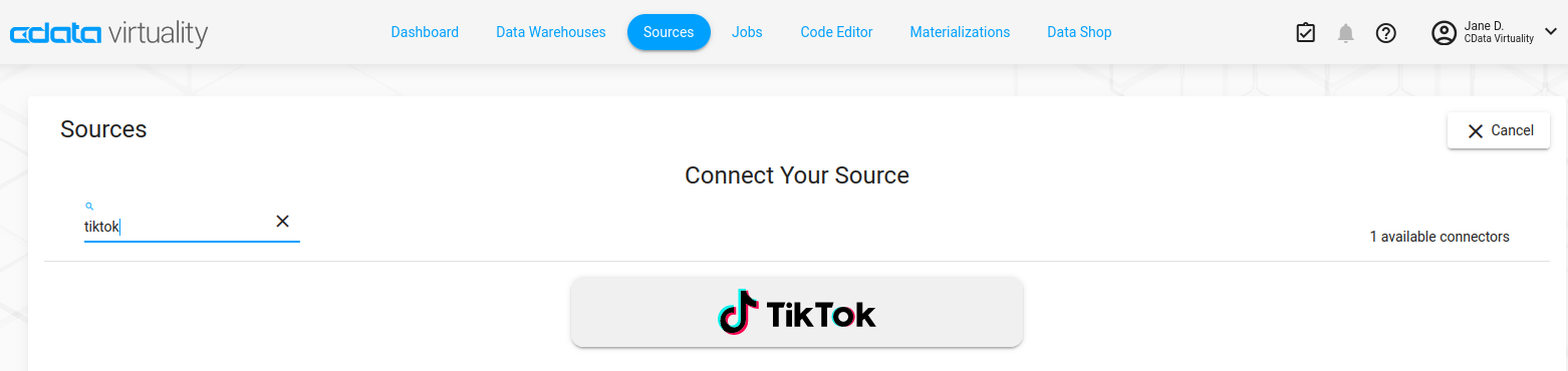 There are two ways to connect to TikTok: via the Sources connection wizard in the Web UI (recommended), or using SQL statements in the CData Virtuality Studio or the Code Editor in the Web UI. Here, we describe the first way; for the second way, see the subpage.