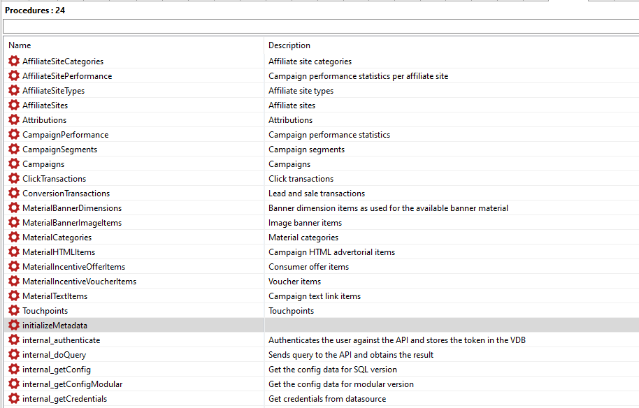 The TradeTracker Merchant API connector introduces a new virtual schema tradetracker_merchant that contains the following stored procedures: