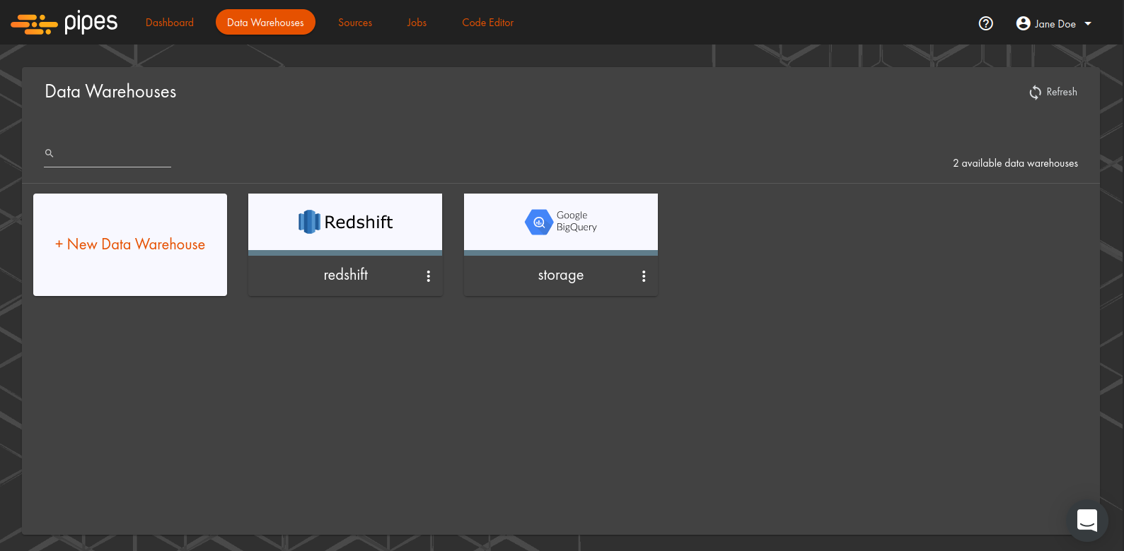 The Data Warehouses page displays information on your connected data warehouse(s) used as a destination and provides easy access to adding another data warehouse if needed.