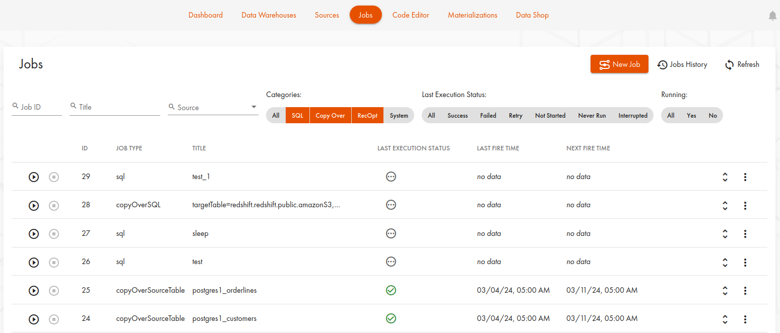 You can search for a specific job ID, title, or source, or filter jobs using the three buttons in the top right corner of the table: SQL, CopyOver, RecOpt, and System. Please note that jobs here are divided into these three categories according to their type of definition: