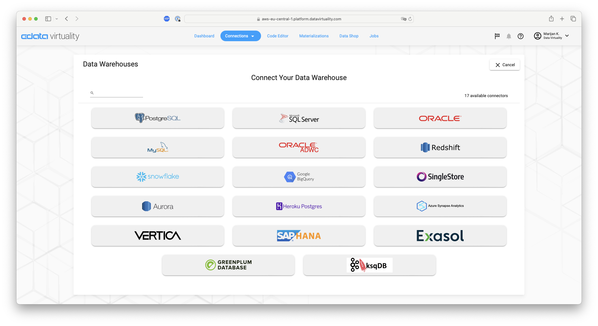 After entering the connection details, click Connect. Once the connection is established, Snowflake will appear in the list of data warehouses under the Data Warehouse tab: