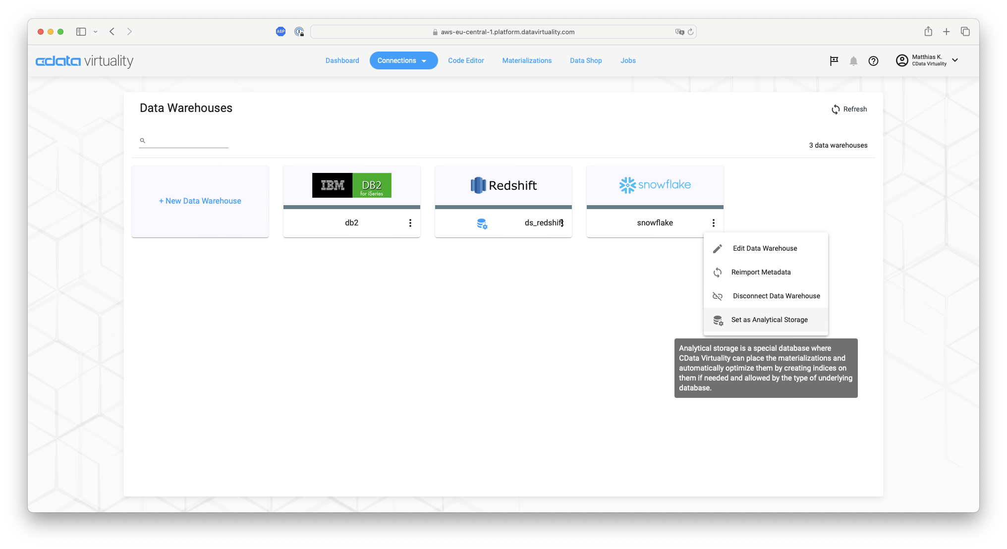 Click the vertical dots in the lower right corner of the Snowflake icon and select Set as Analytical Storage from the context menu: