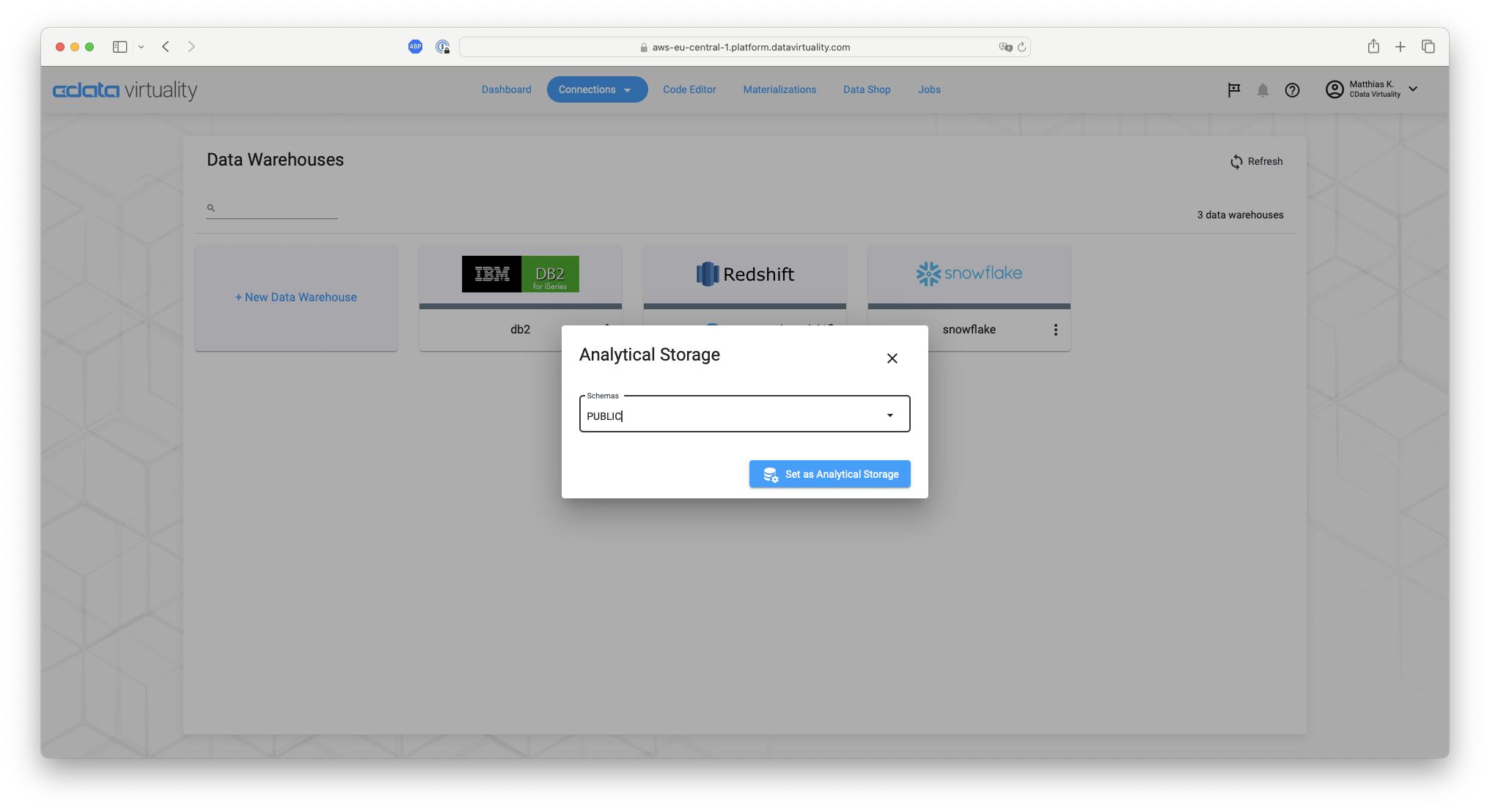 Type in the desired Schema (e.g., PUBLIC) and click the Set as Analytical Storage button finalize the configuration:
