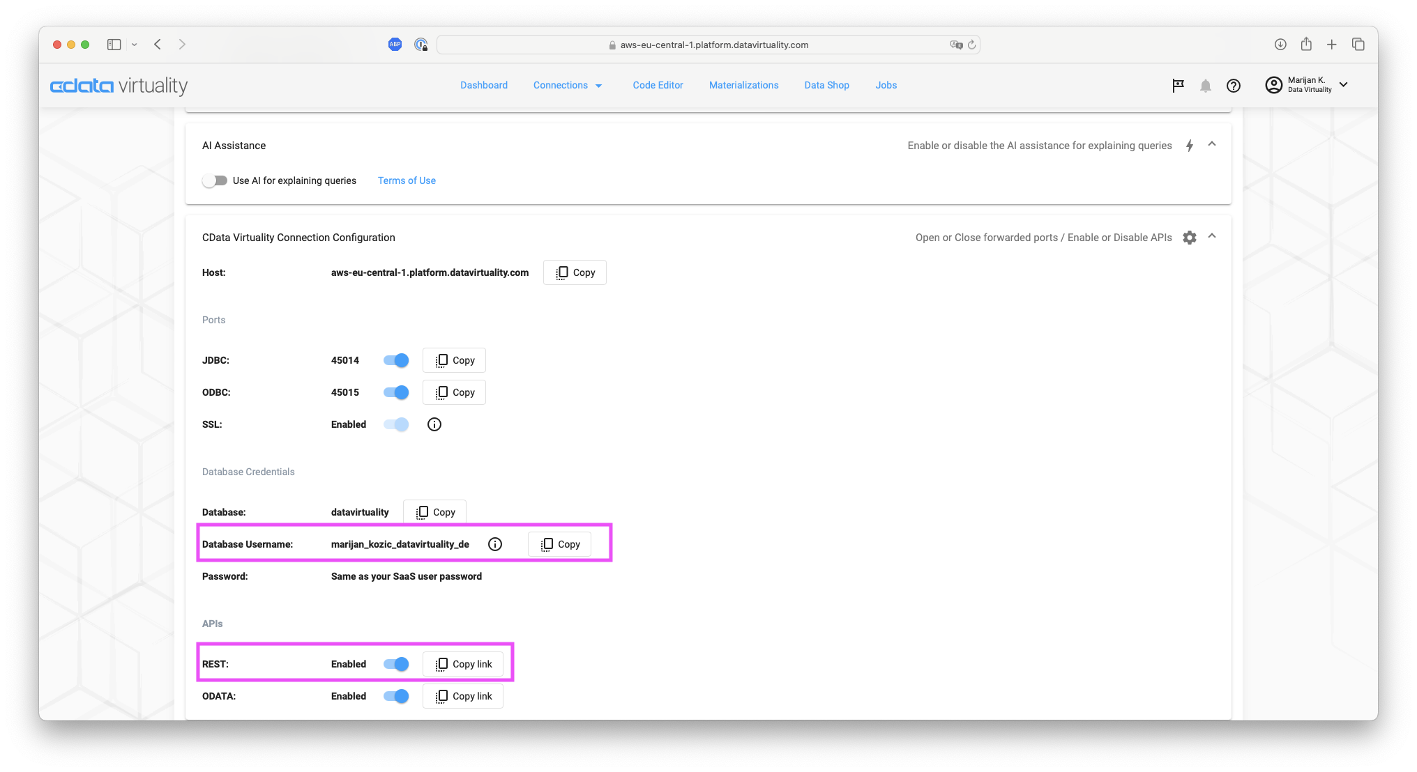 The API endpoints for the SaaS version can be obtained from the Preferences section in the CData Virtuality Web UI: