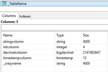 columnsAndTypes => 'stringColumn,intColumn|integer,decimalColumn|decimal,timestampColumn|timestamp,_crazyName'