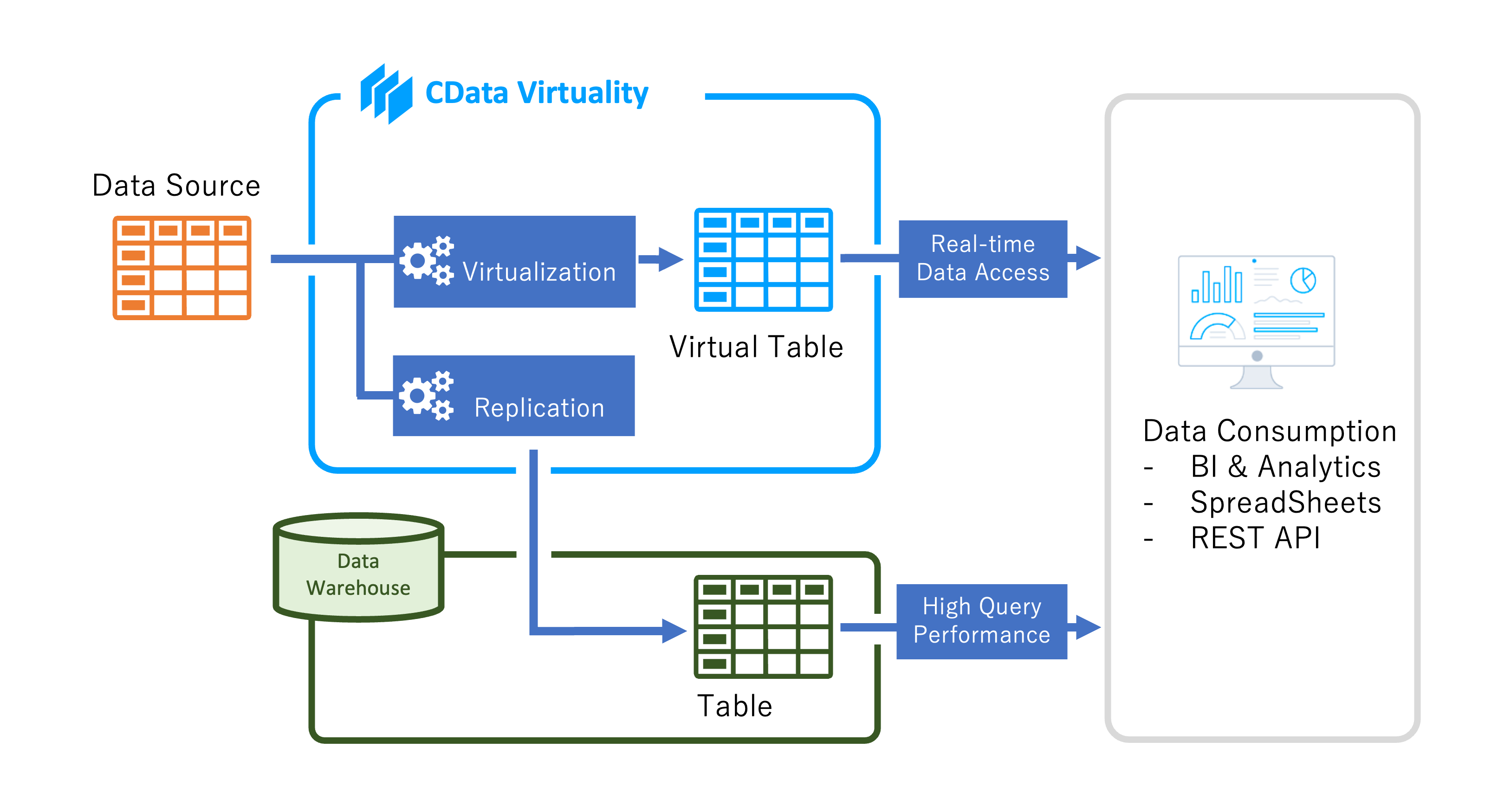 In addition to real-time data access enabled by its data virtualization capabilities, CData Virtuality supports data collaboration through bimodal data replication, offering ETL/ELT.