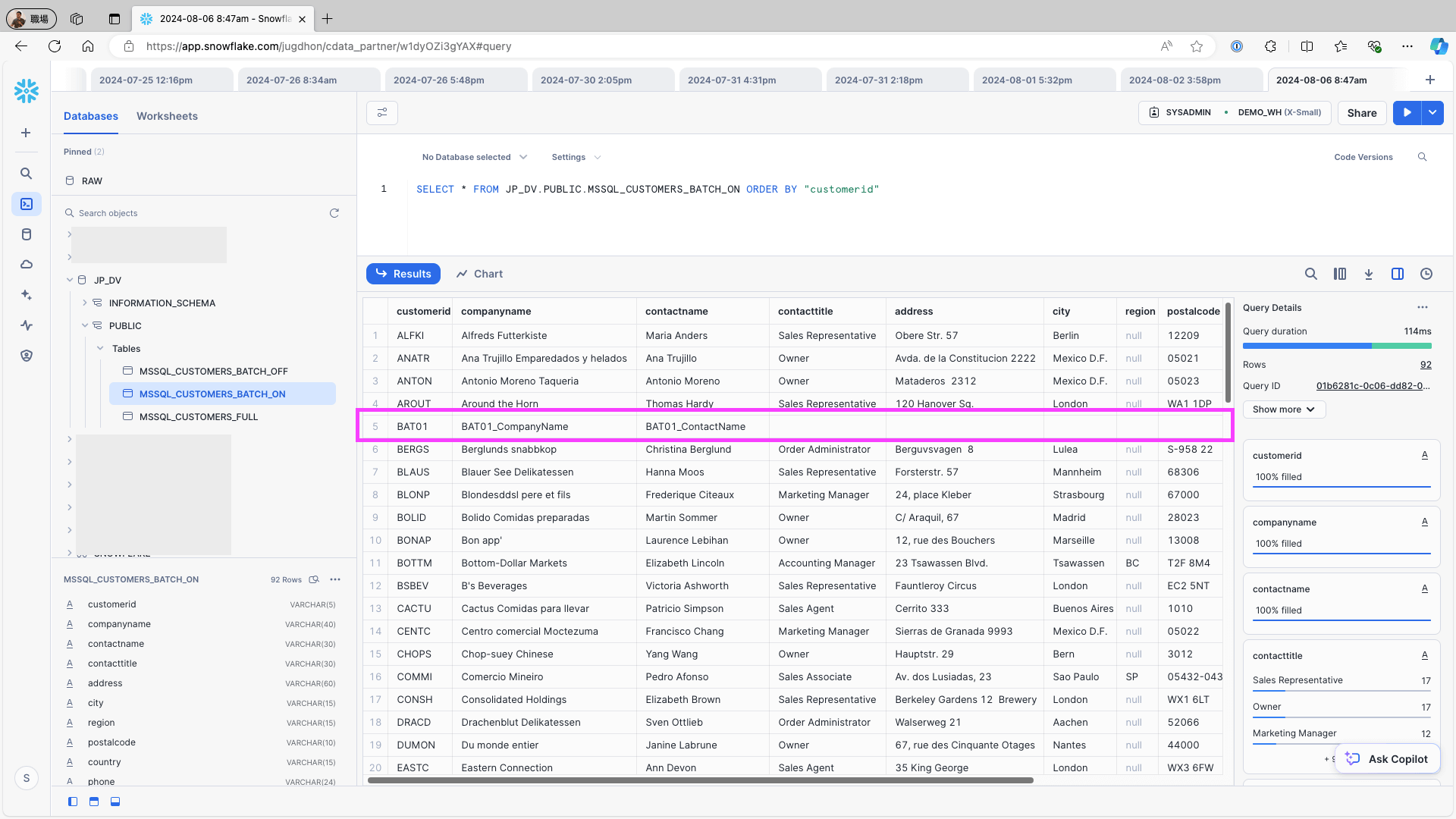 Access Snowflake and confirm that the data is stored in the respective tables: