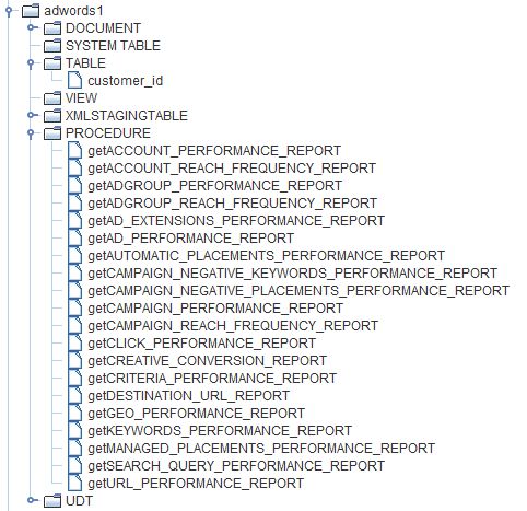 The CData Virtuality Server supports querying the Ads Reporting API from Google. The Ads Service provides a number of reports for each clientCustomerId. clientCustomerIds are presented in the customer_id table. The CData Virtuality Server presents reports themselves as stored procedures, whereby there is a single stored procedure per report type prefixed by "get":