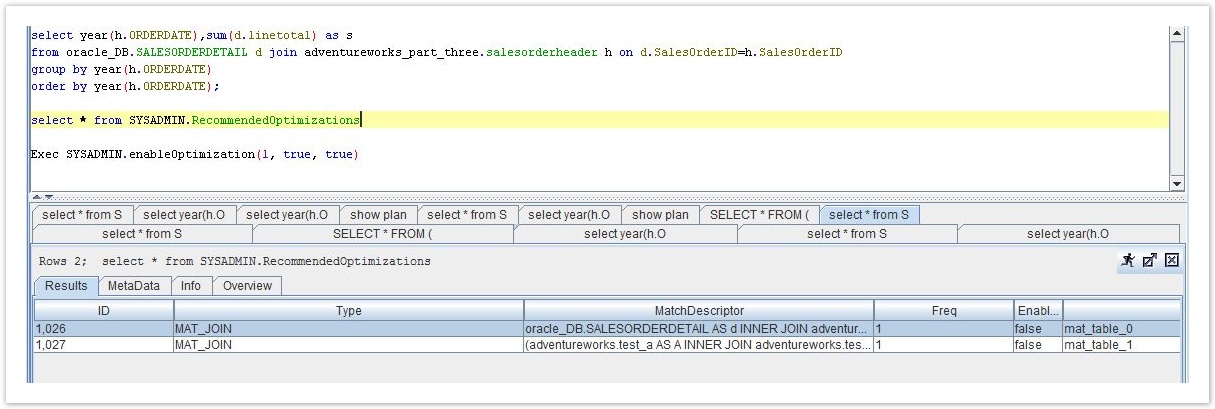 Both of the created recommended optimizations are of type MAT_JOIN, meaning that an appropriate (sub-)structure of the query represents a JOIN of two elements. Another type of a recommended optimization is TABLE, which is created when a request for a single table like SELECT * FROM datasourceA.tableX is issued.