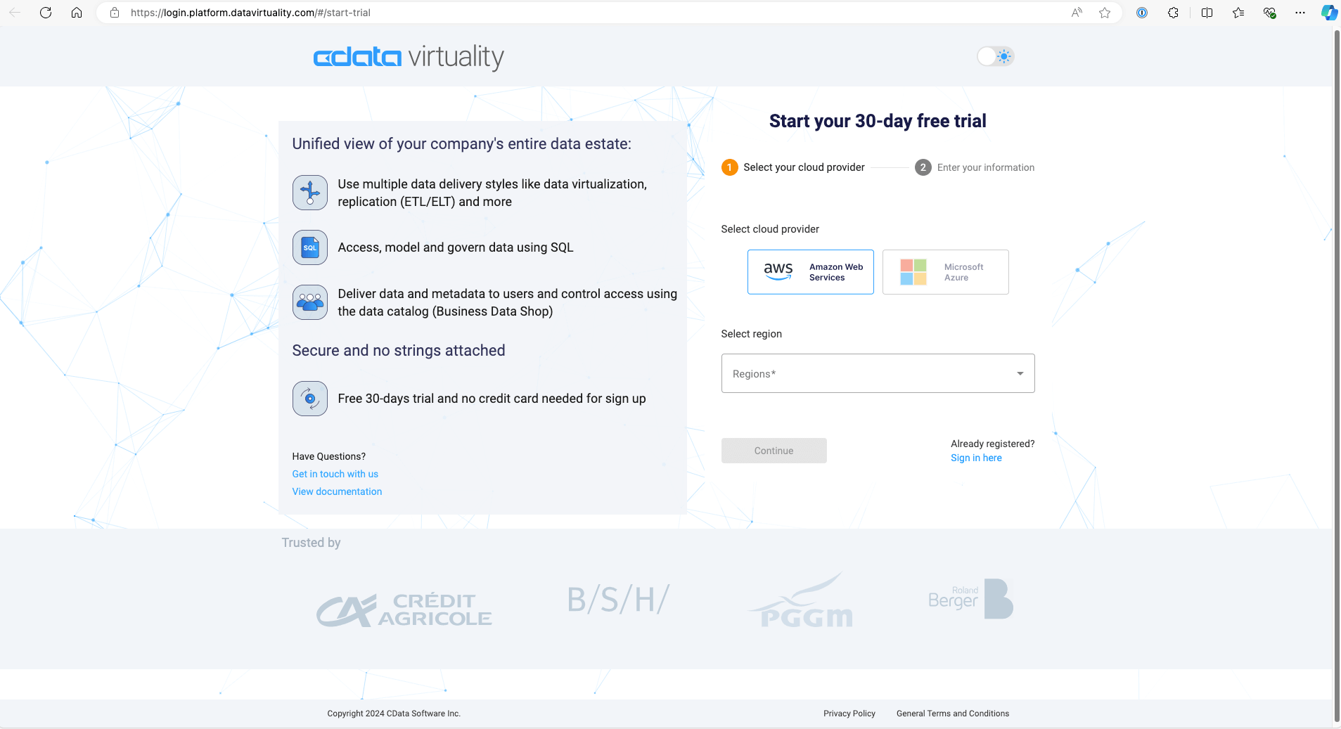 To get started with CData Virtuality, visit the sign-up page and follow the instructions outlined below to begin the setup.