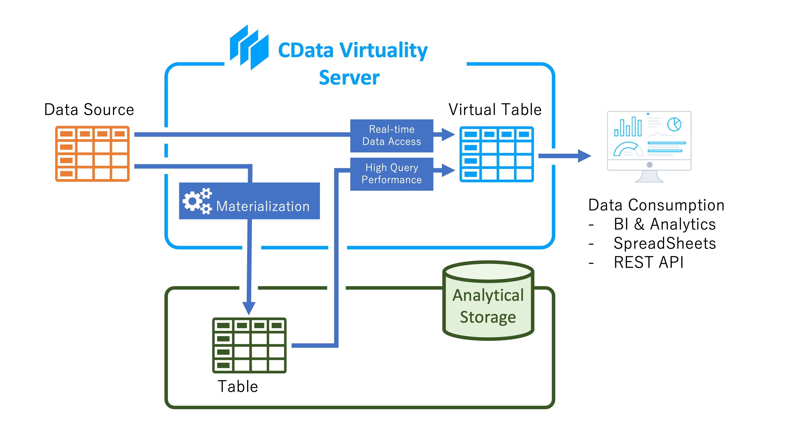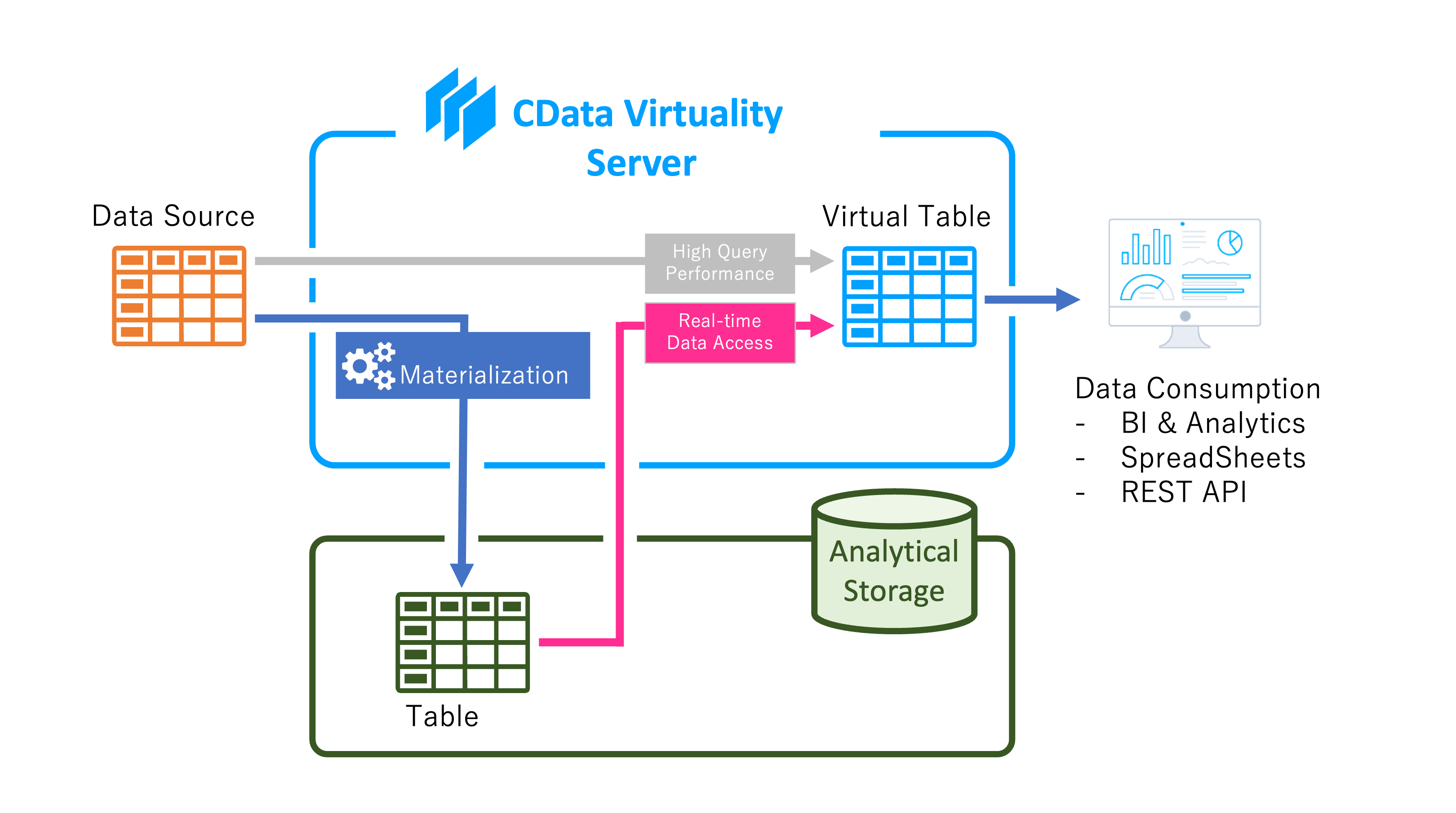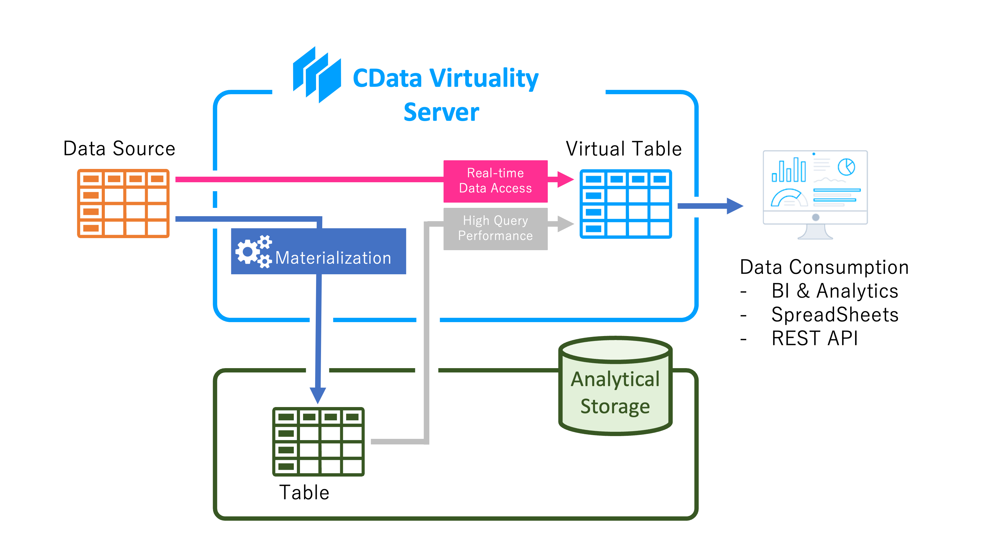 CData Virtuality offers a feature called materialization that caches data to accelerate data retrieval. The goal of materialization is to allow users to access data without being concerned about the performance (response time) or the impact (high load) on the data source. This ensures a seamless experience for users who can retrieve data through the CData Virtuality Server without needing to know where the data originates or modifying their business logic.