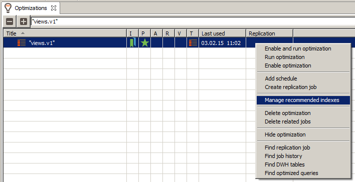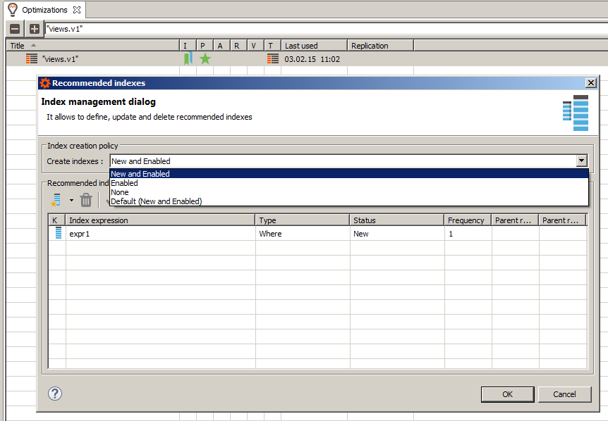 - Select Manage recommended indexes from the context menu. The management dialogue for this optimization will open: