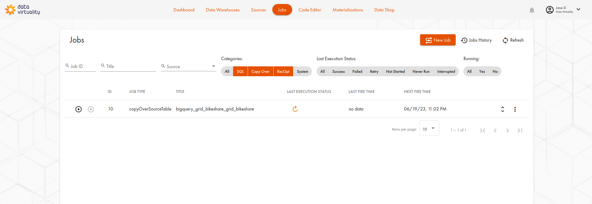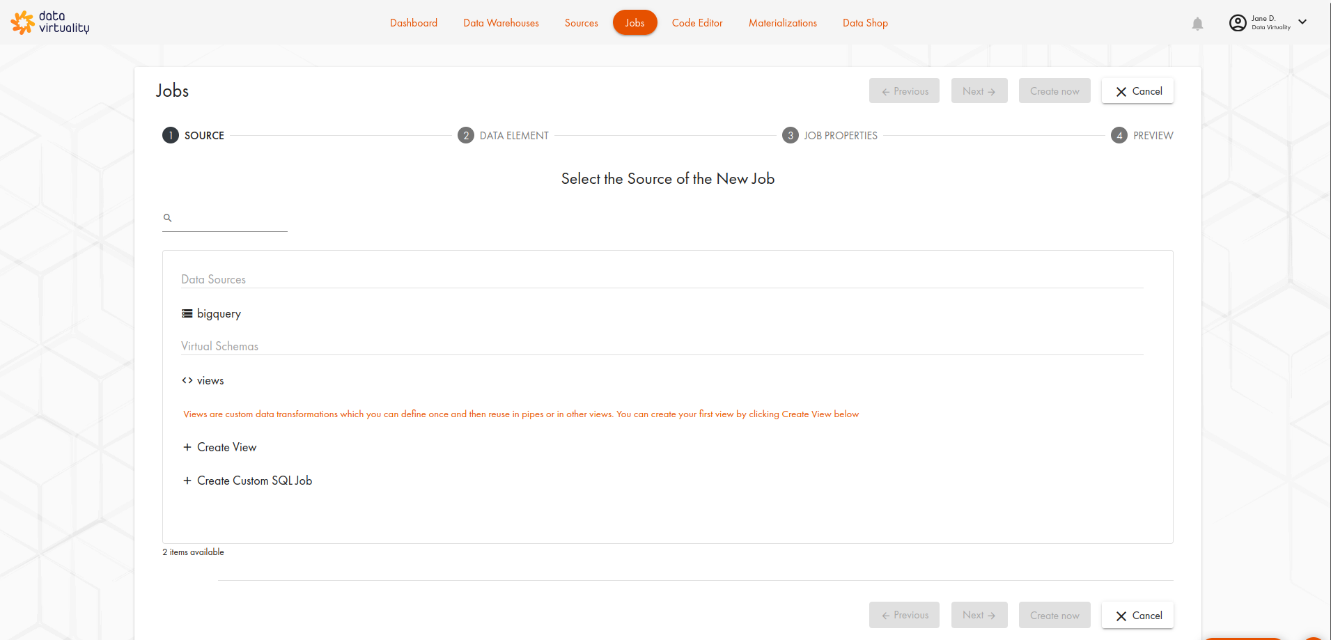 This tab provides a wizard for creating a new job for already connected data sources.