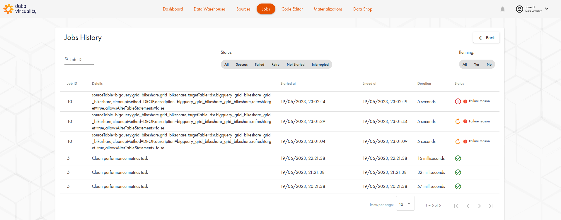 This tab displays essential information on all jobs running in your instance.
