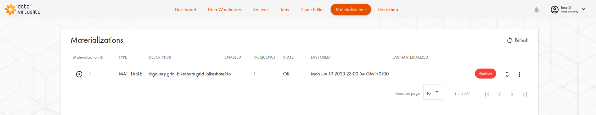 This tab displays, specifically, information on materialization jobs. As you are using your instance, Data Virtuality will also suggest optimizations for your jobs, and the recommendations will be shown here as well.