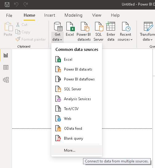 Choose Get Data -> (More…) -> Database -> Data Virtuality Platform. This can be done either at the startup screen or the Ribbon:
