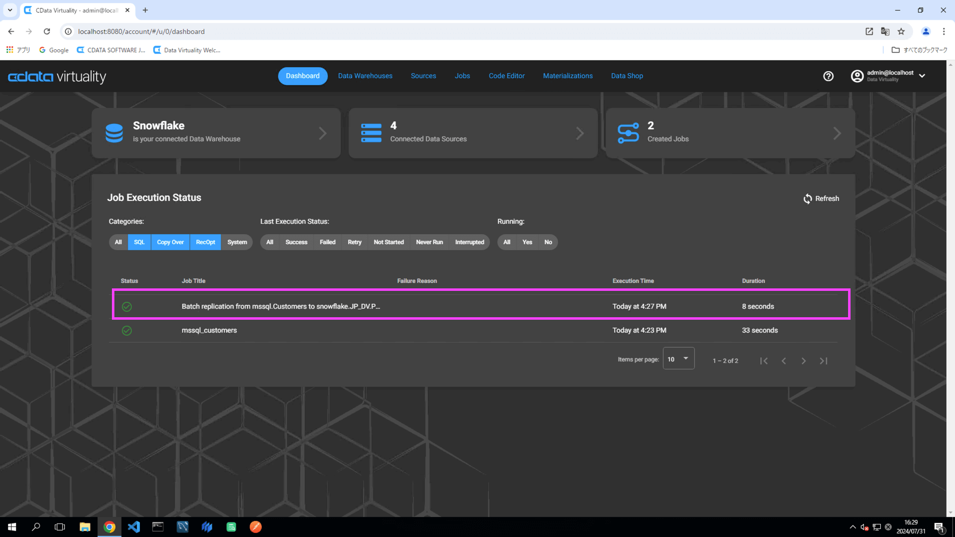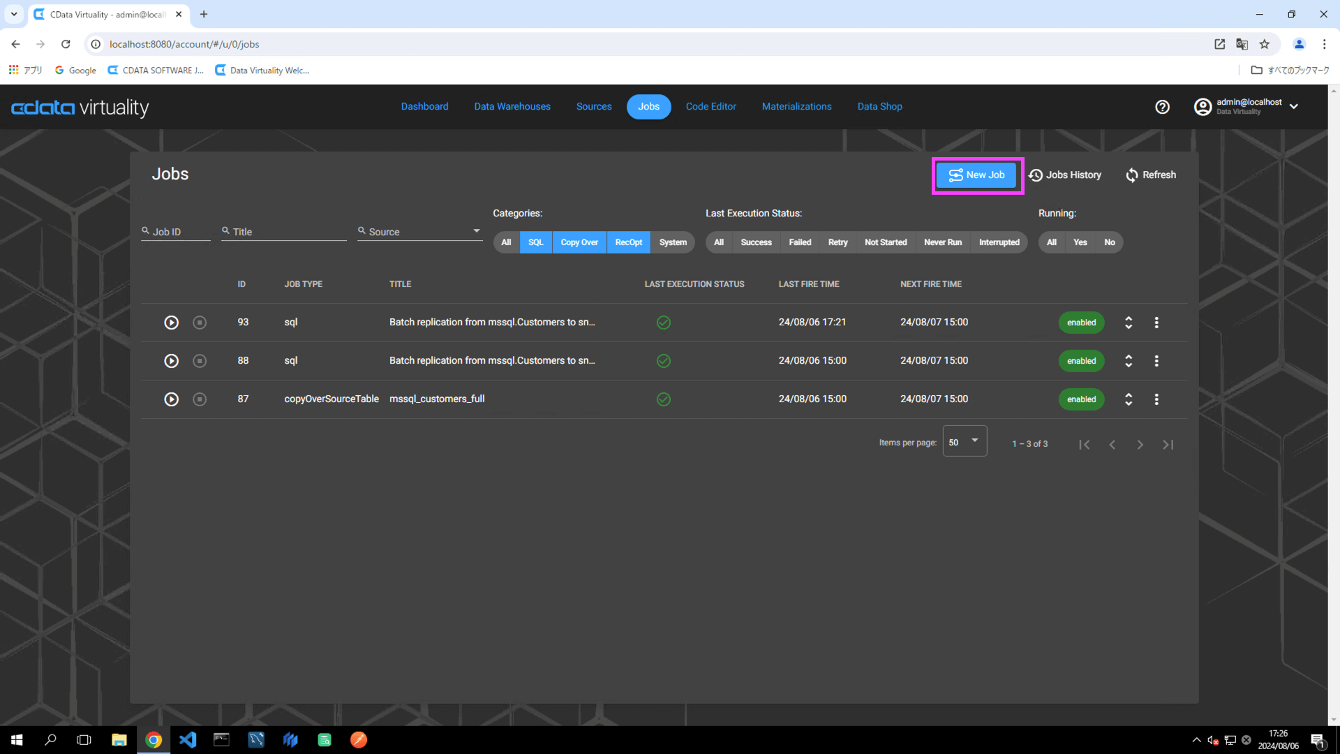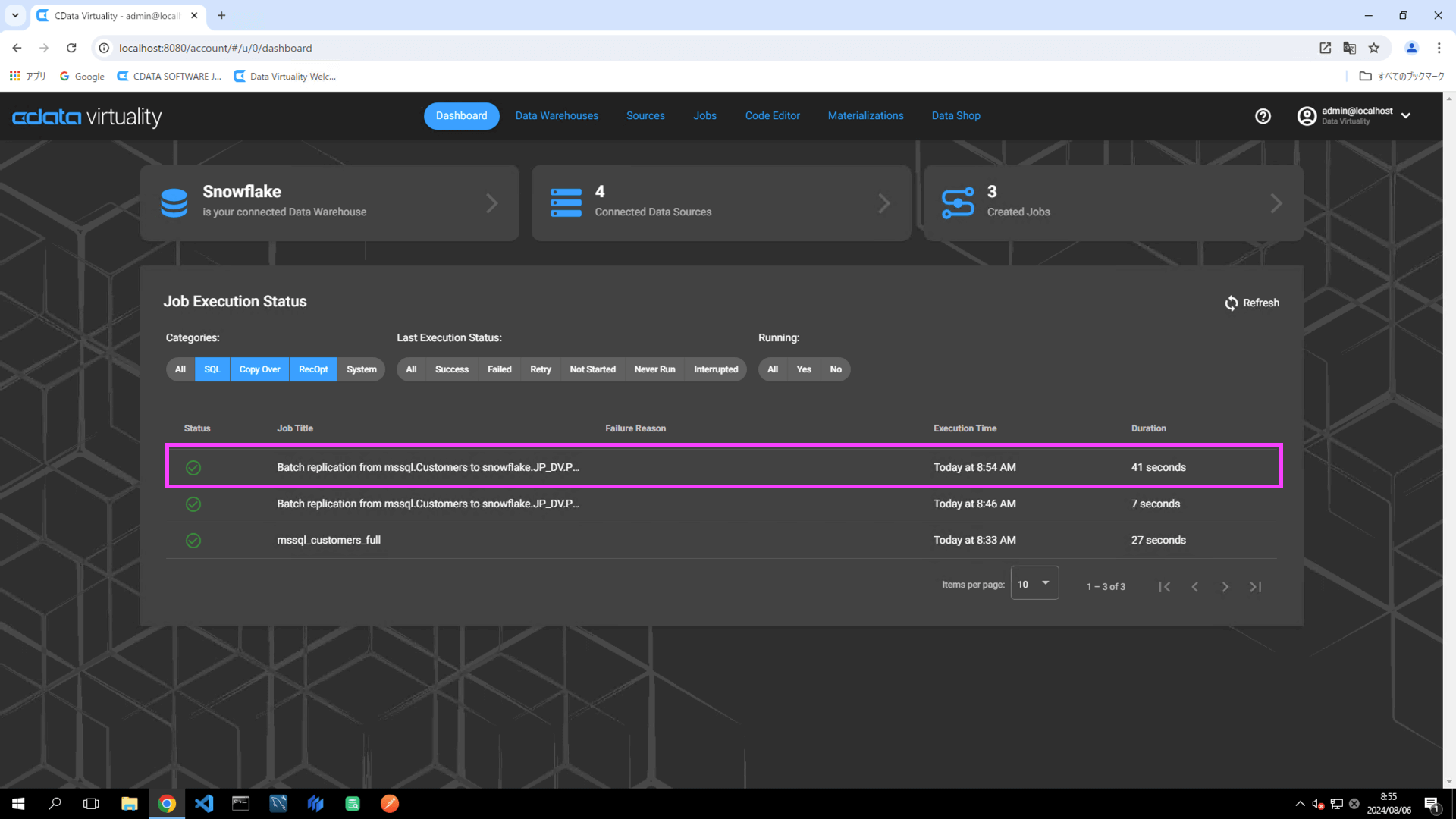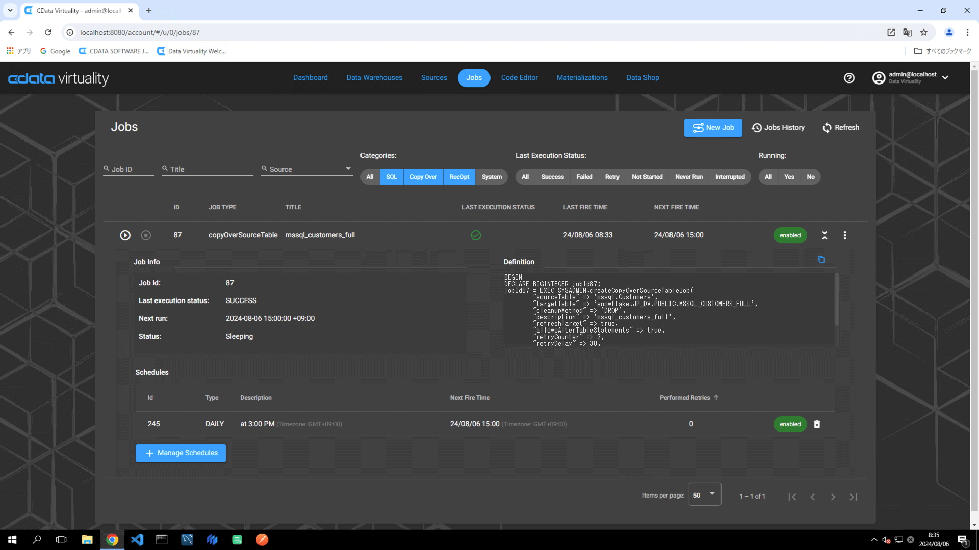 The details of the created job can be accessed and modified from the Jobs screen. The job will have the JOB TYPE set to sql and the TITLE as Batch replication from mssql.Customers to snowfl: