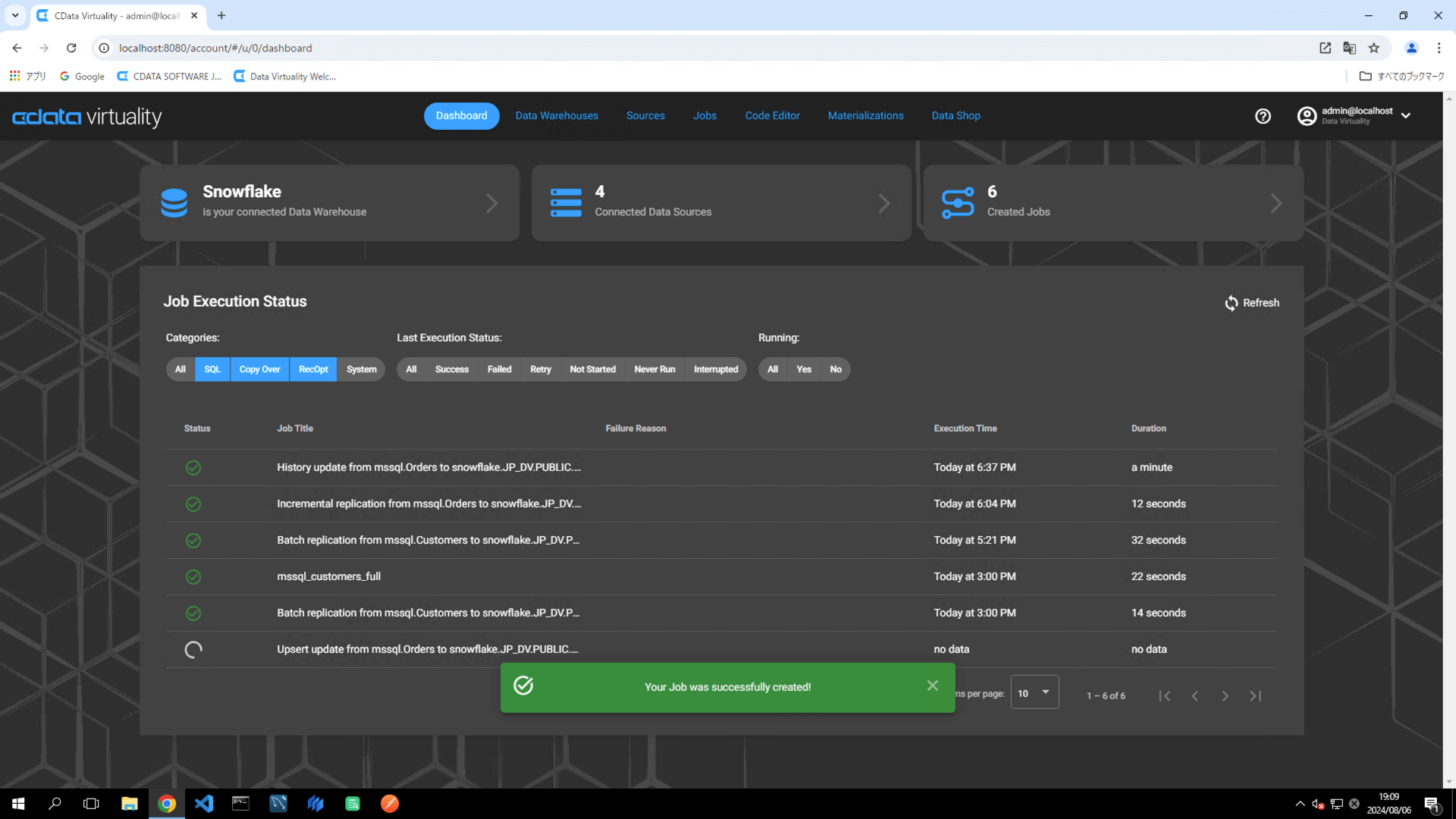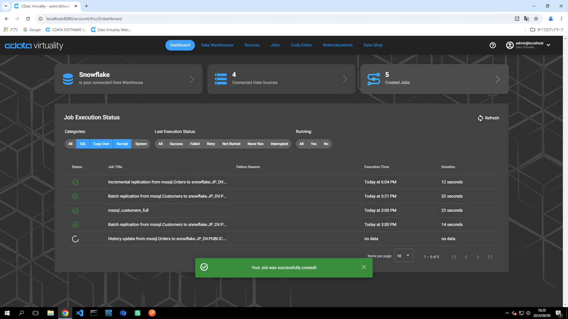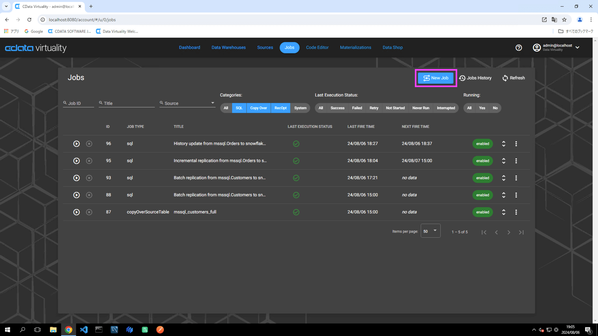 The details of the created job can be accessed and modified from the Jobs screen. The job will have the JOB TYPE set to sql and the TITLE as Batch replication from mssql.Customers to snowfl:
