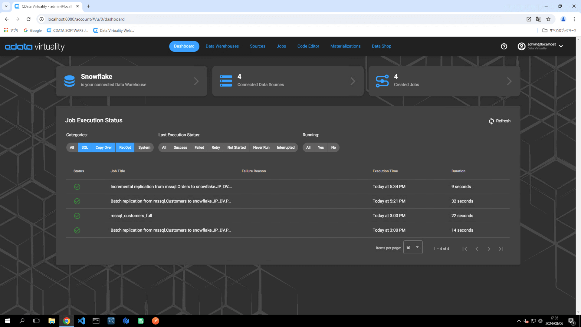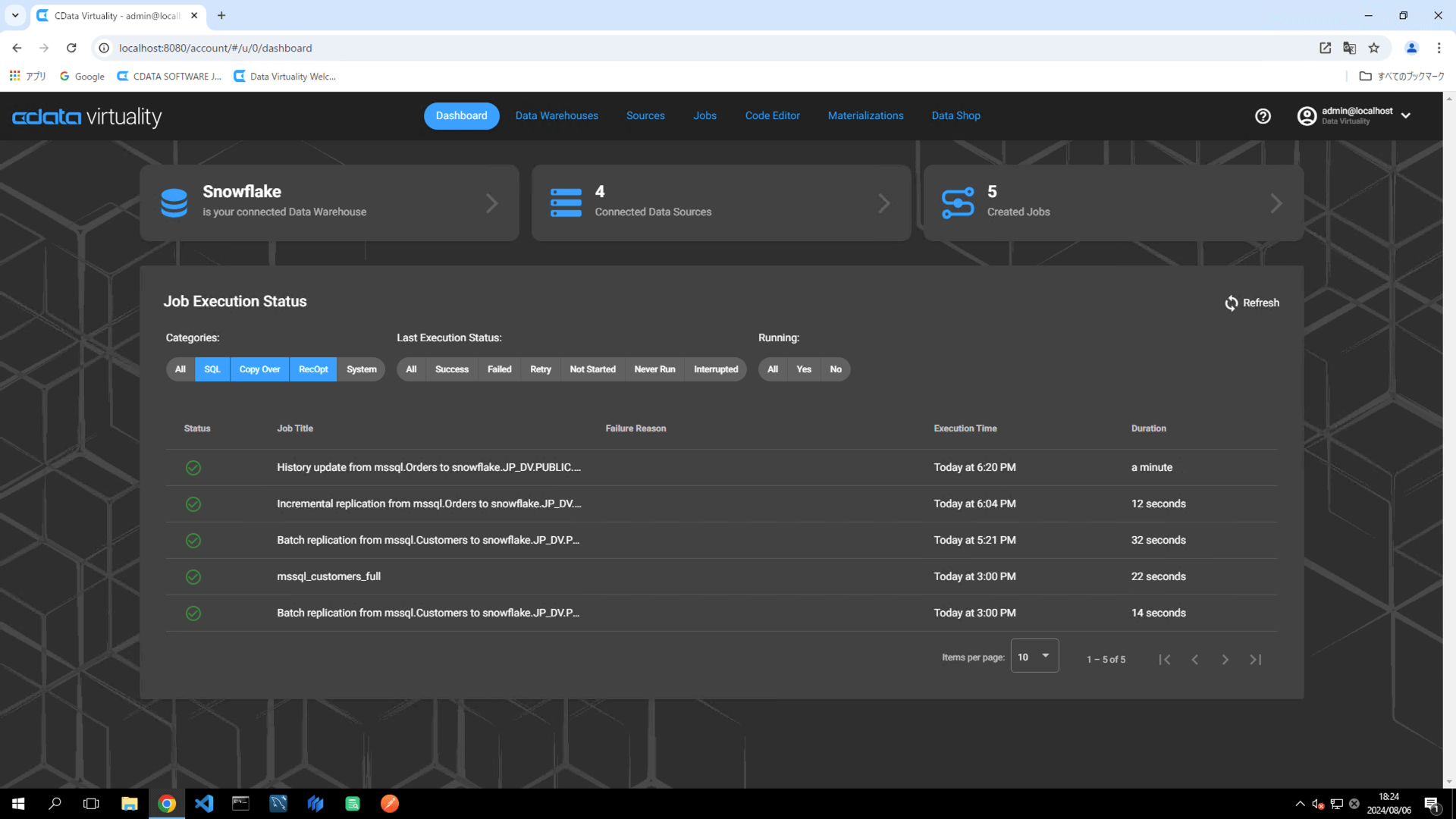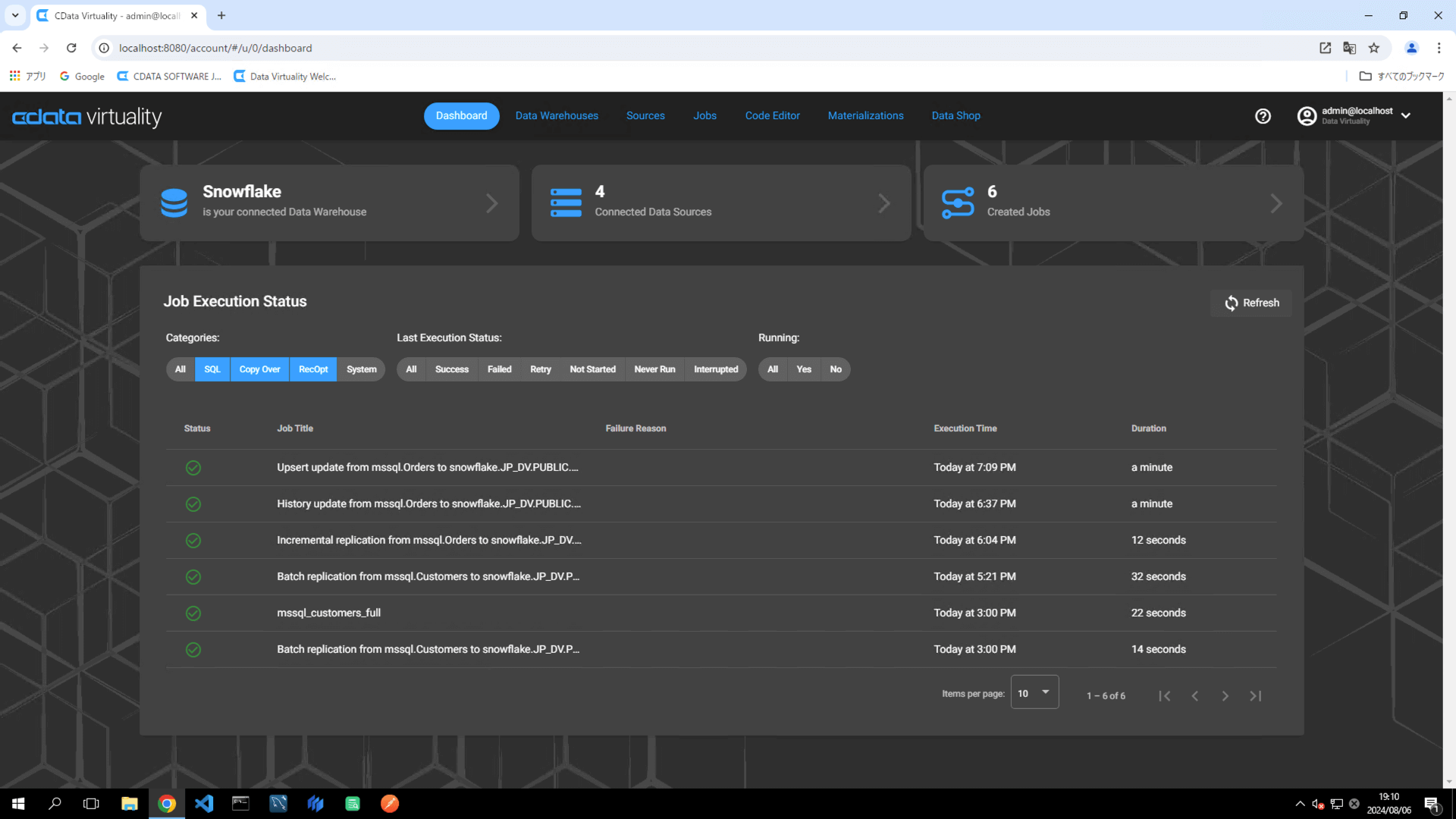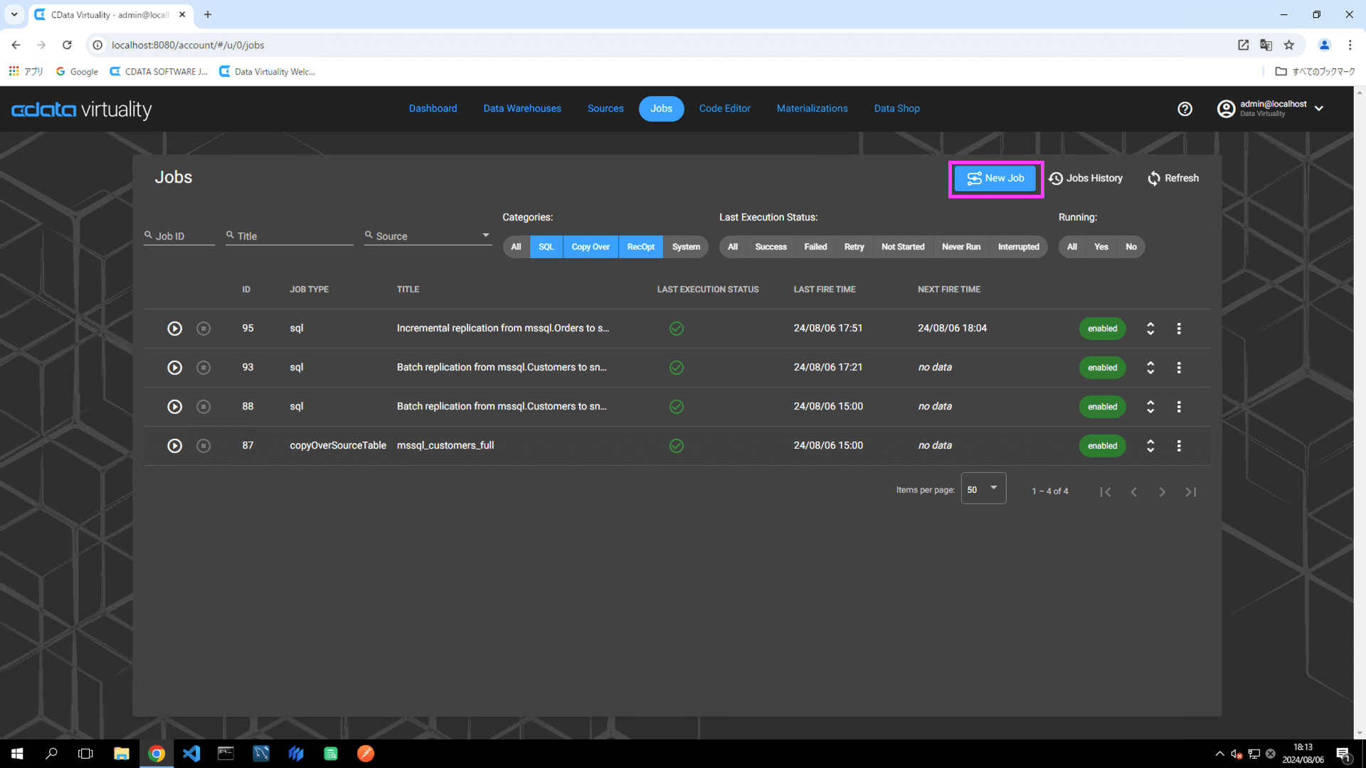 The details of the created job can be accessed and modified from the Jobs screen. The job will have the JOB TYPE set to sql and the TITLE as Batch replication from mssql.Customers to snowfl:
