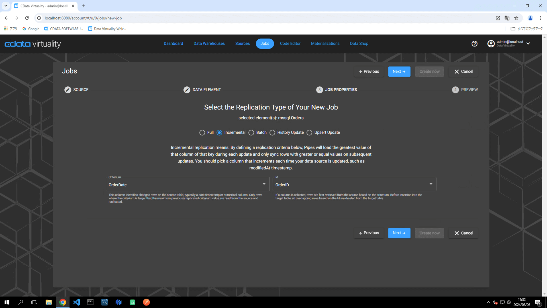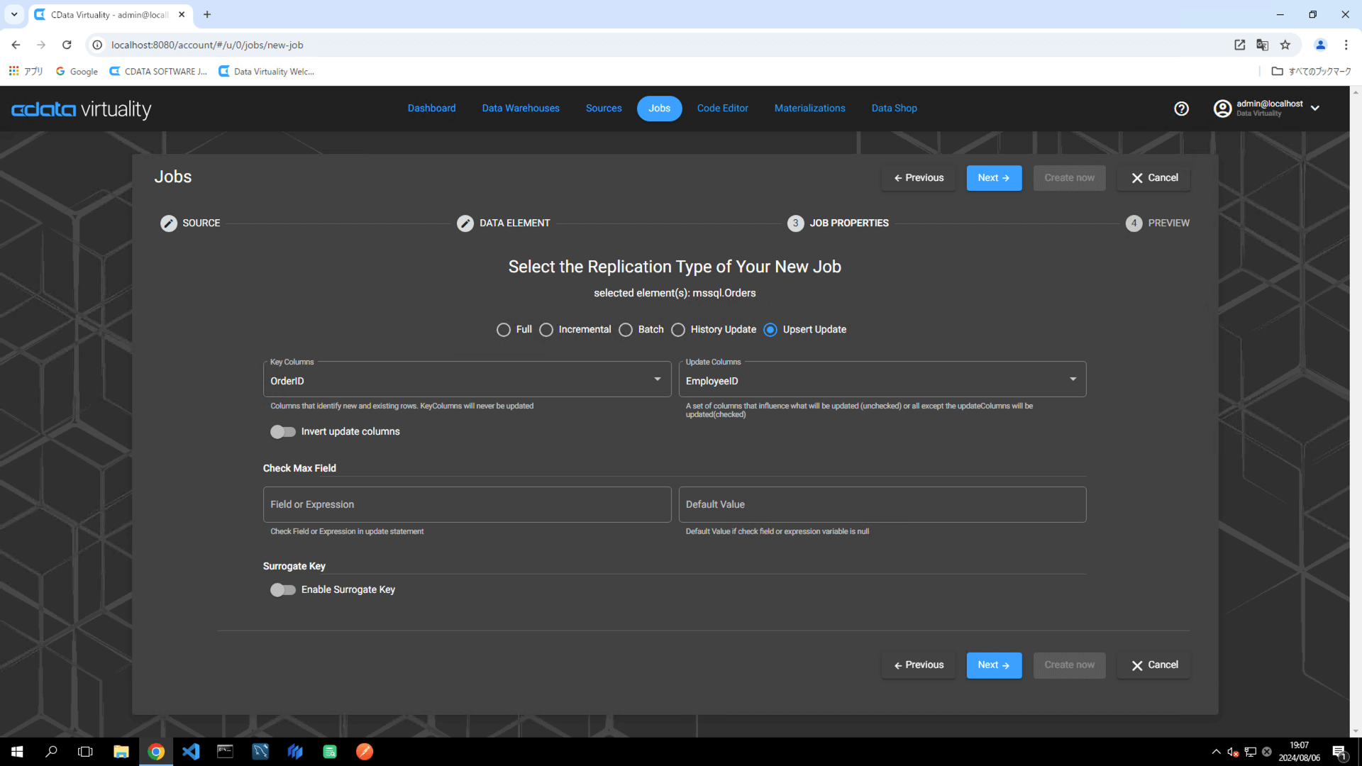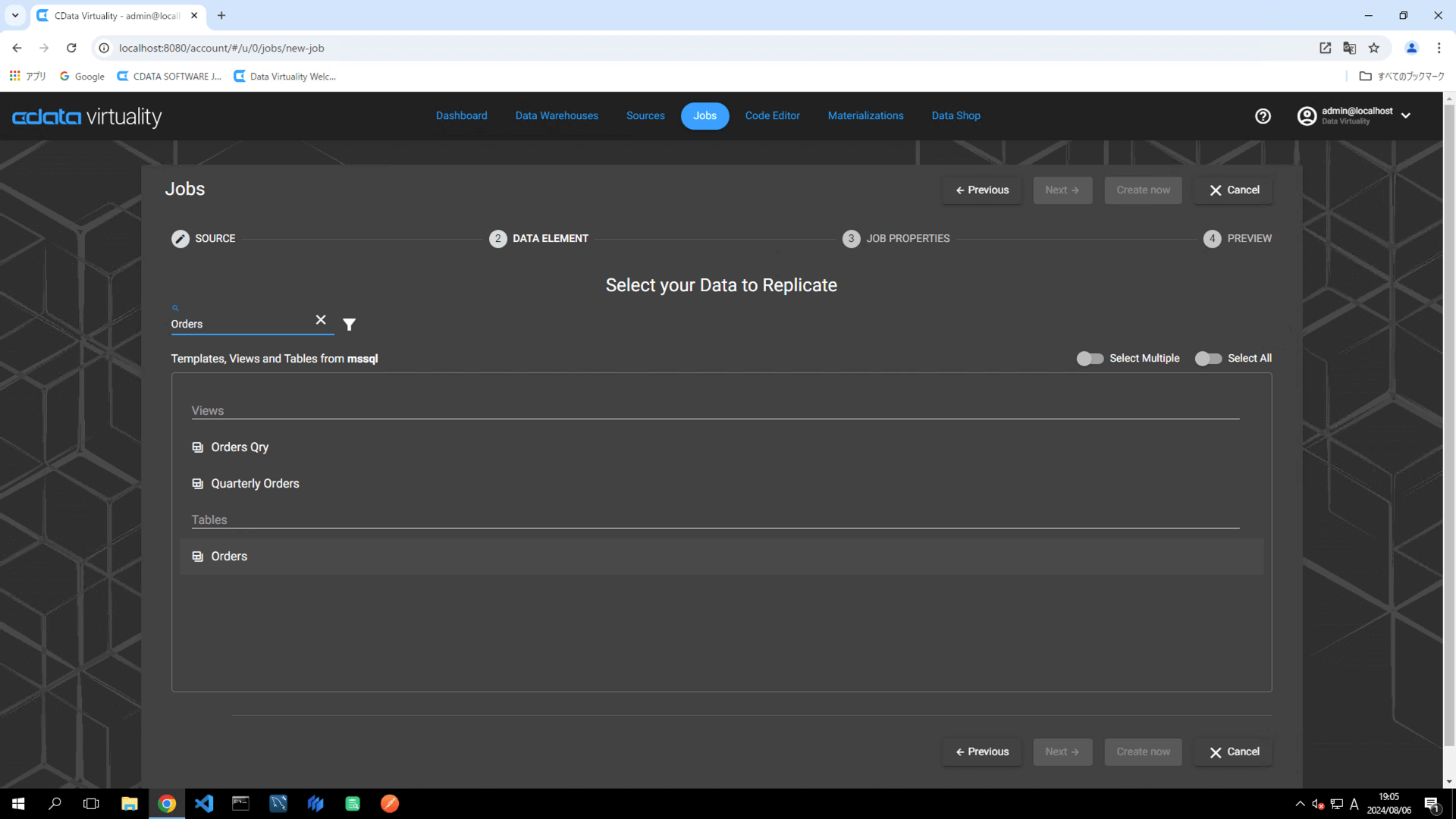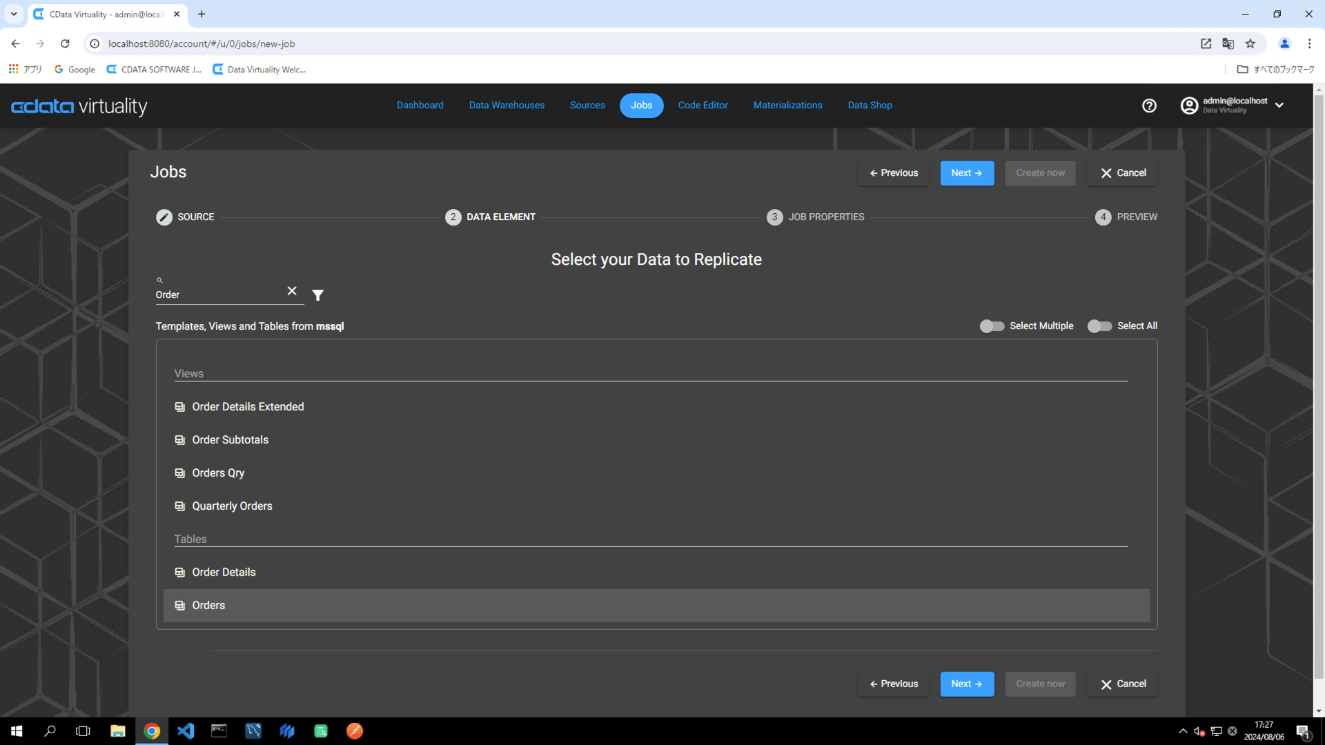 For this example, the Orders table in Microsoft SQL Server is selected.